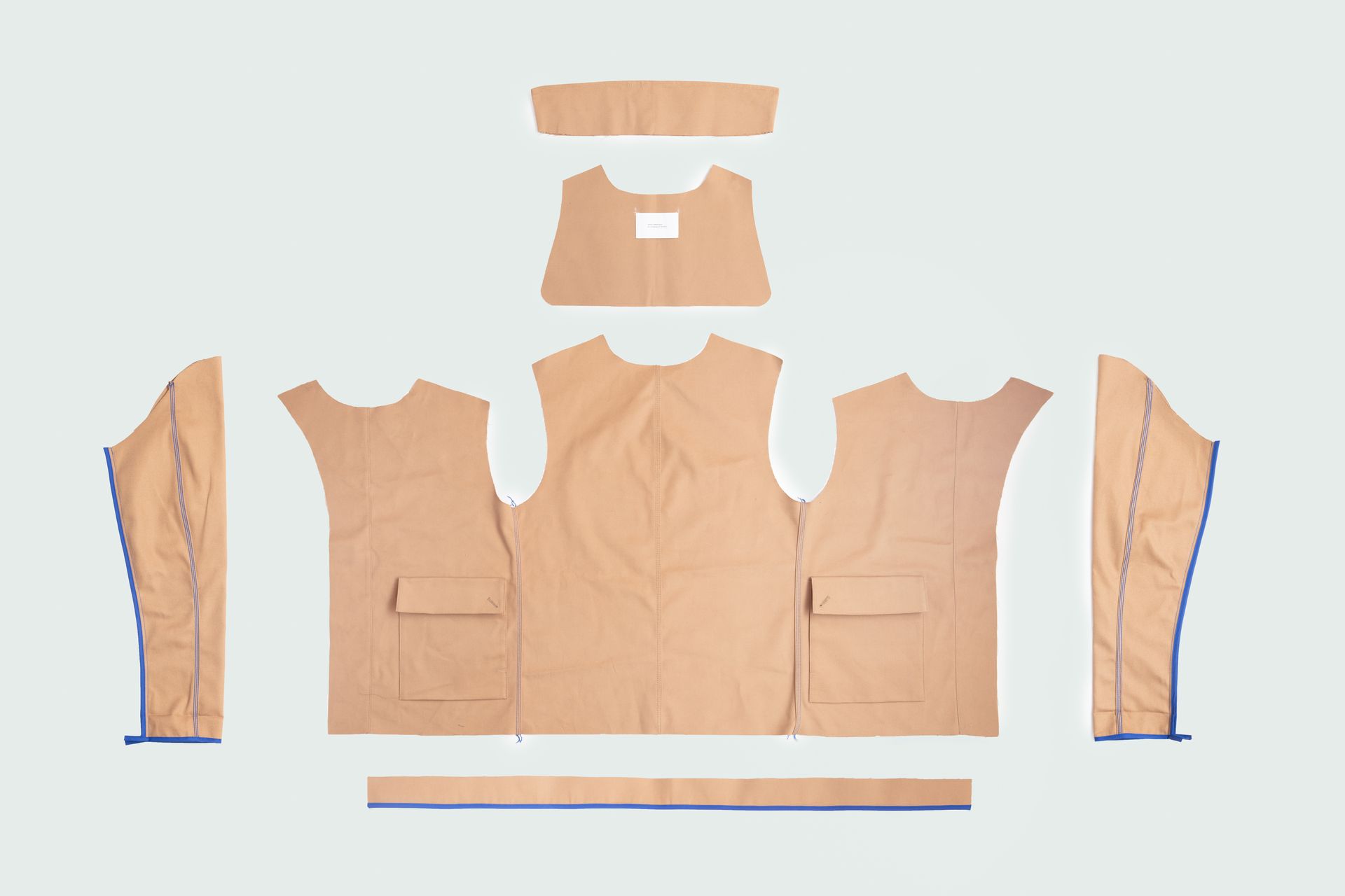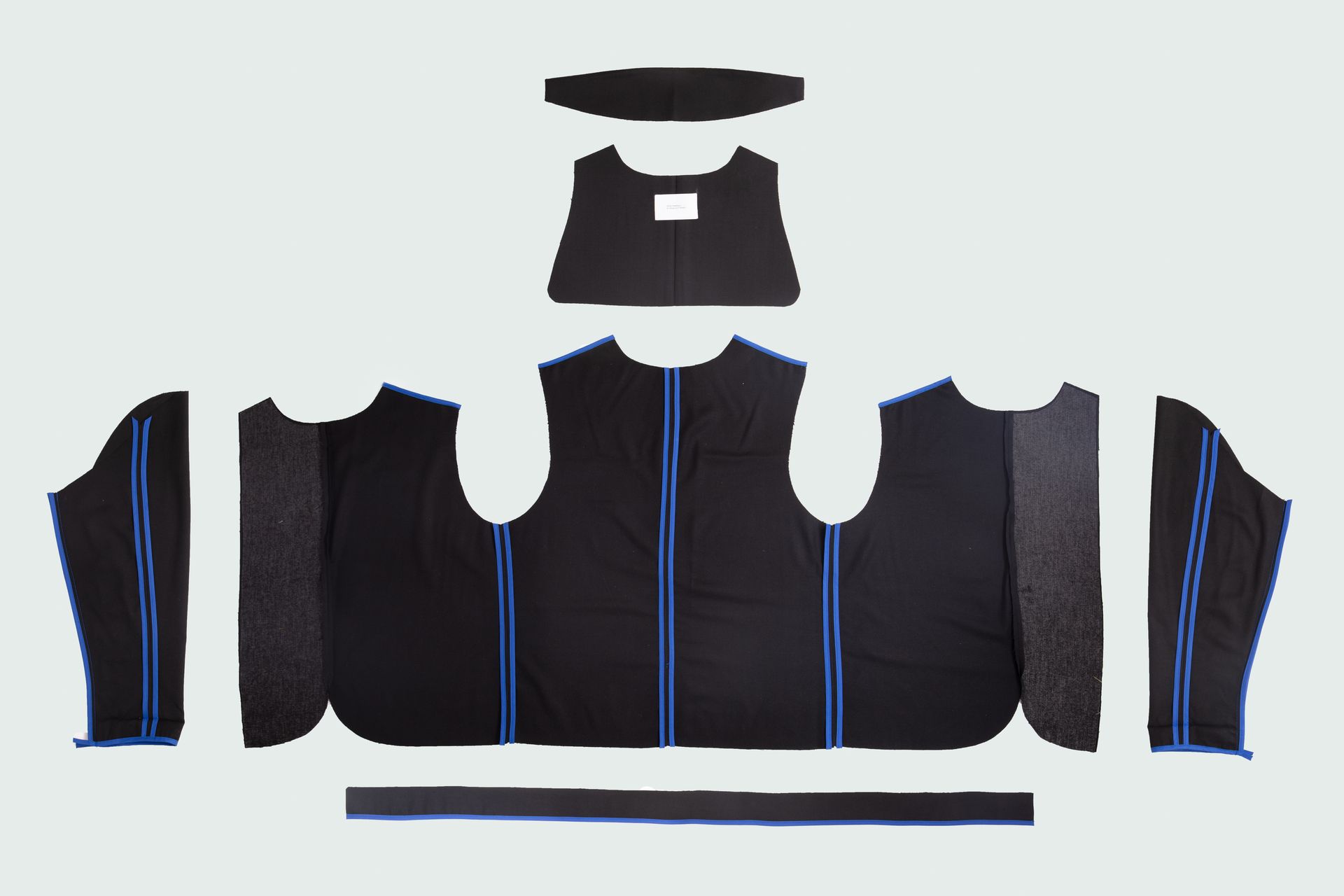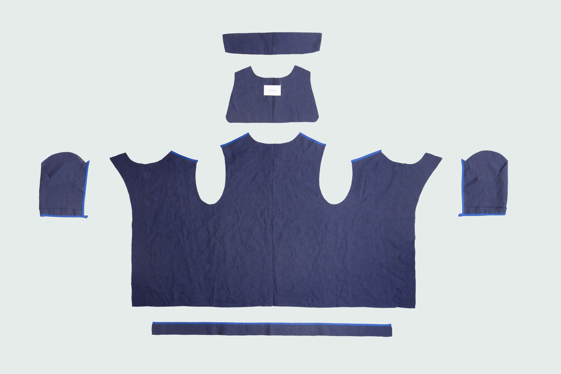 A key principle in our design philosophy is the focus on local production. We honor a minimalist approach, where each pattern piece is carefully considered for its functionality and ease of production. Our goal is to minimize the number of pattern pieces, only adding seam lines if they serve a purpose. We emphasize the aesthetic of using large fabric pieces that fluently drape around the body untouched by seams. The approach of a streamlined design process and emphasizing the beauty of minimalism is a key advantage in terms of local production. Every garment is crafted directly in our Copenhagen workshop, allowing us to create small quantities with various style options and fabric choices within the same production batch. This strategy helps us avoid overproduction. We developed a modular system of a few pattern pieces categorized in A, B and C. A : jackets, coats, dress shirts, blazers, sweatshirts and t-shirts B : trousers C : skirts, dresses and tops