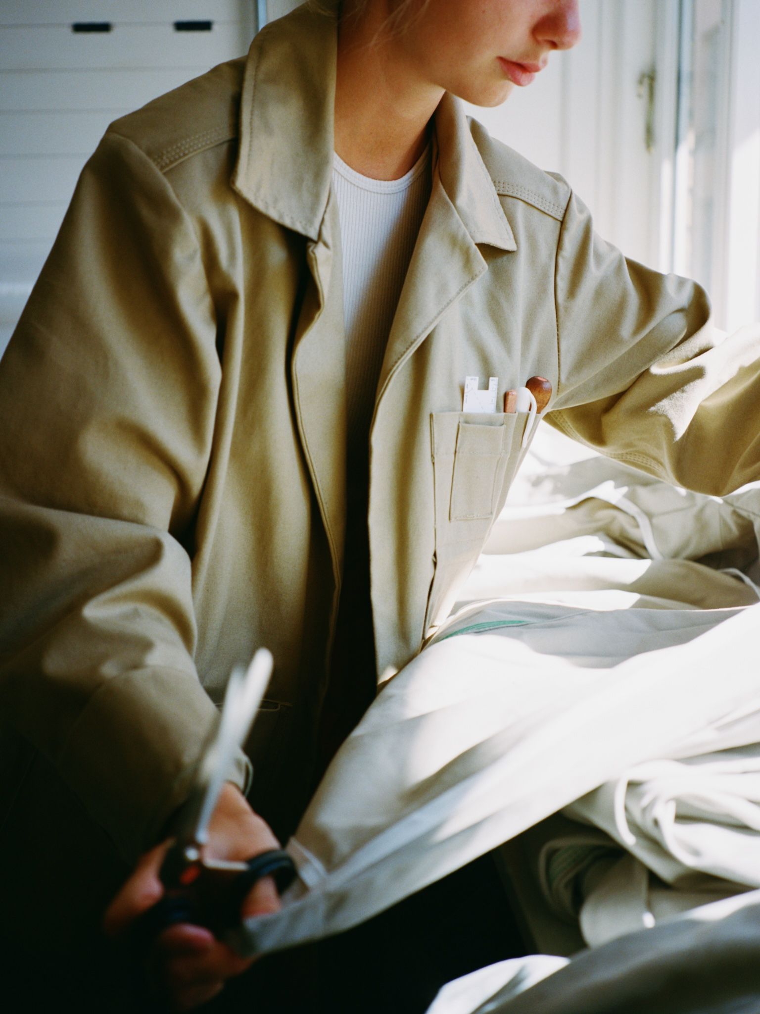 Our production follows a made-to-order approach, allowing us to adjust each item to meet the unique measurements of our customers. This personalized adjustment service covers details such as sleeve and body length, as well as waist and leg length. We firmly believe that creating garments that are specifically adapted to our customers fosters a stronger personal connection and increases the longevity of the product.
