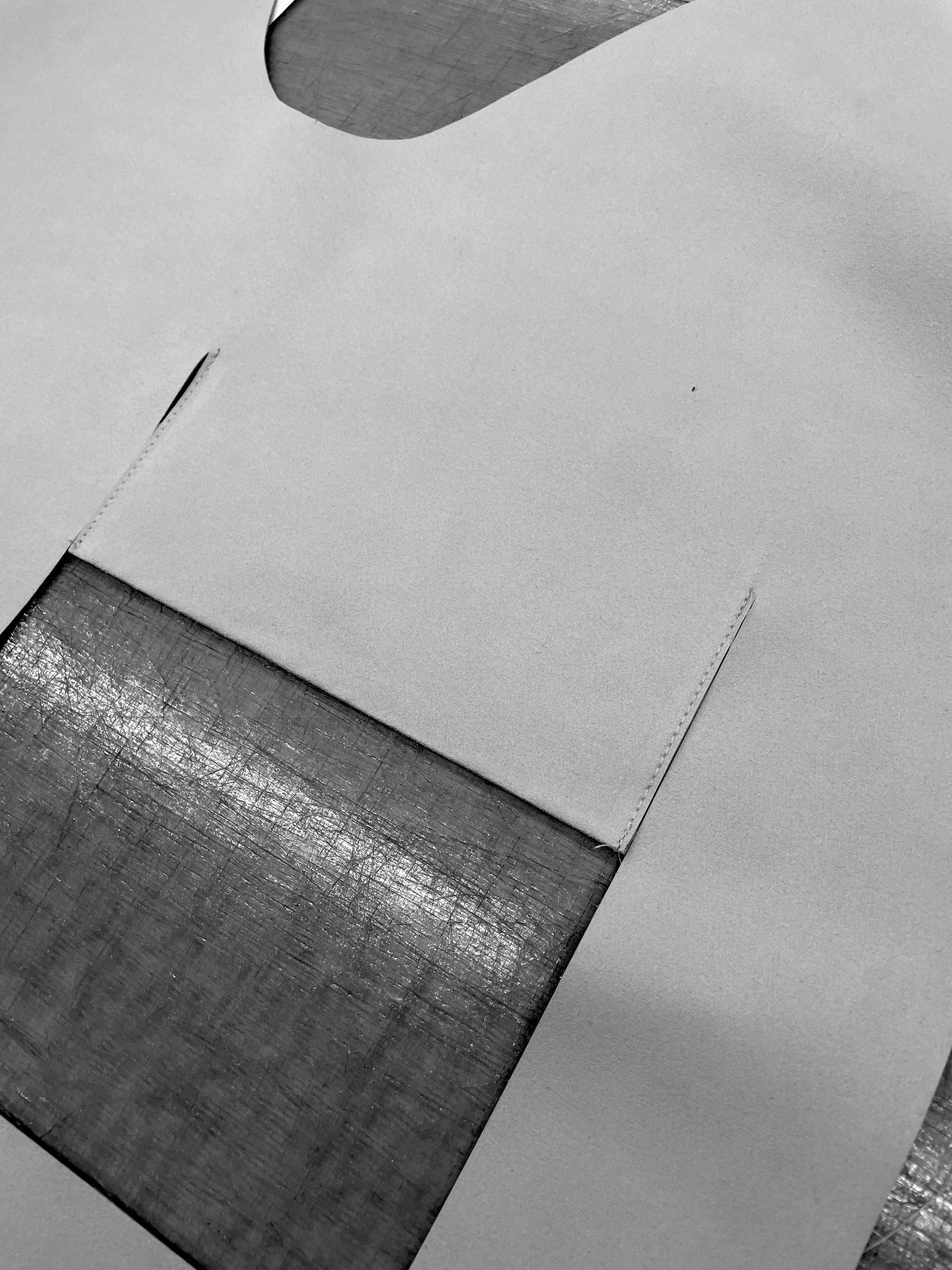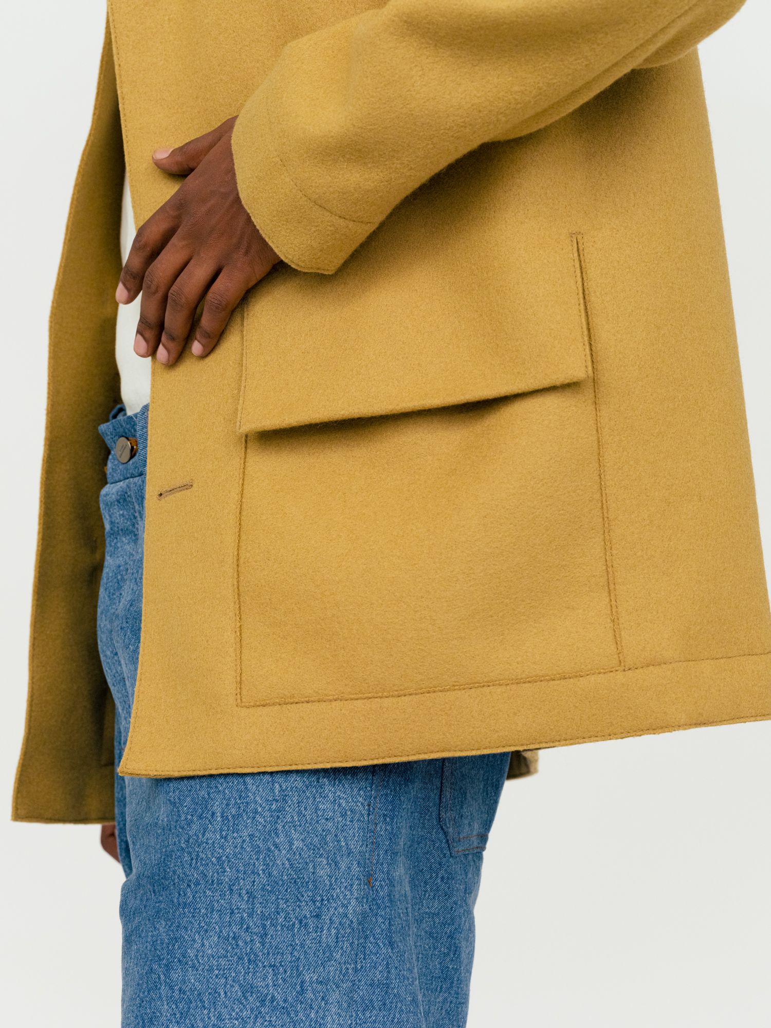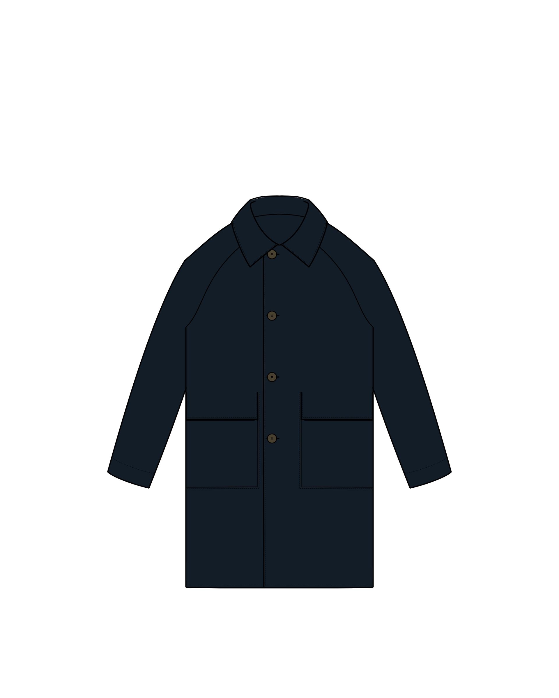 The A pattern has been lengthened and transformed into a coat using Kvadrat’s sturdy furniture textile weighing 550 g/m with a Martindale of 100,000, ensuring unusual durability. This textile, resembling felt, allows for open seam spaces with raw edges that do not unravel. To leverage this characteristic, we have omitted seam allowances. Instead, the fabric is stitched together in two layers at the end, forming a significant part of the overall aesthetic while minimizing production time. The items have a sharp-edged sculptural and architectural expression.