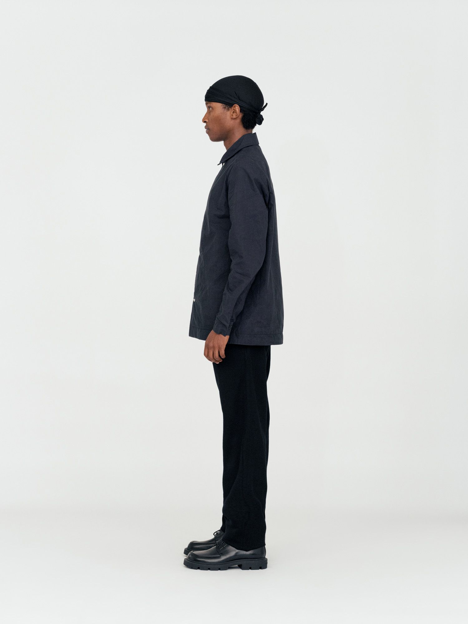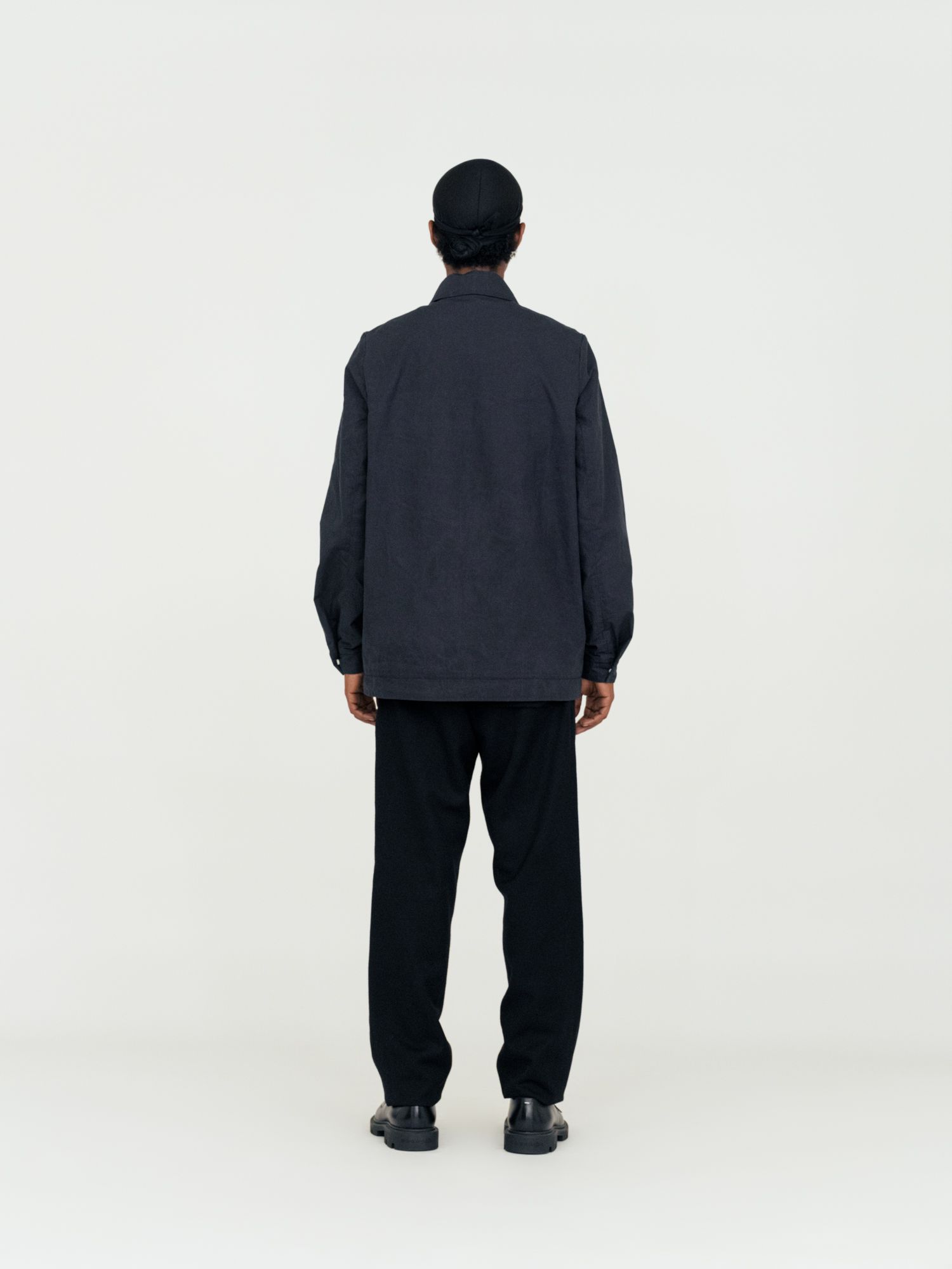 Relaxed fit shirt. Mother-of-pearl buttons on body and cuffs. Inside blue lining. Unisex..