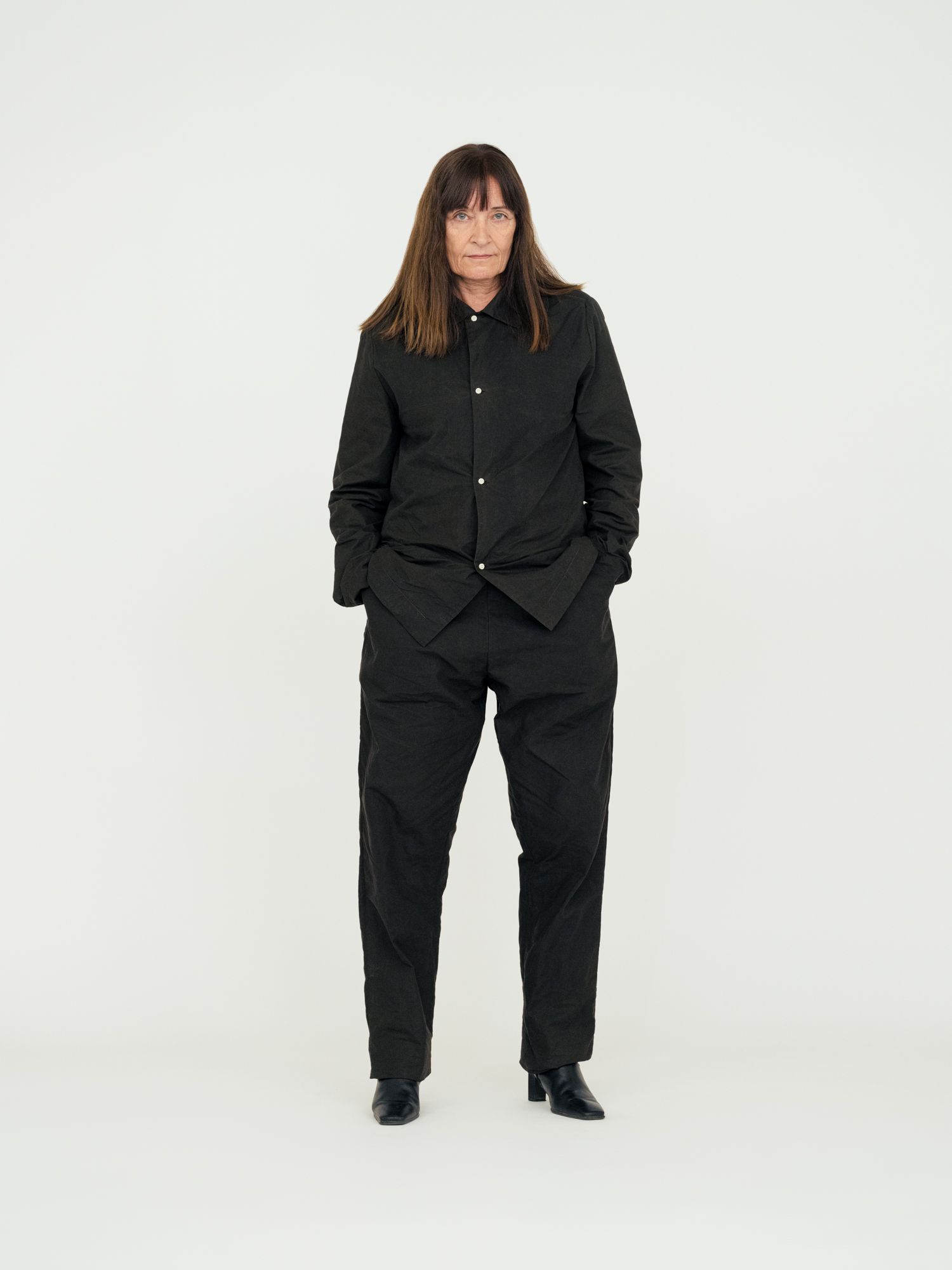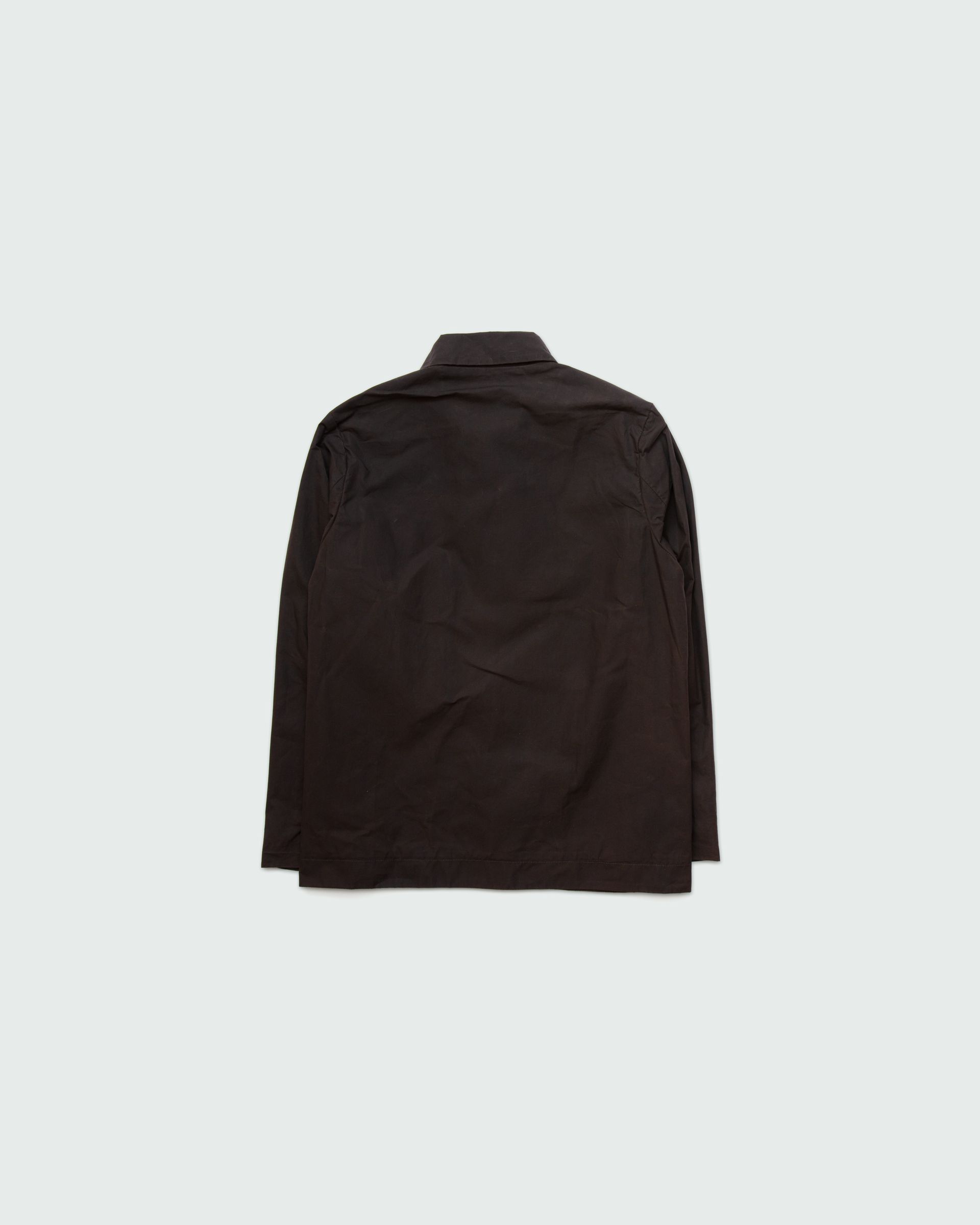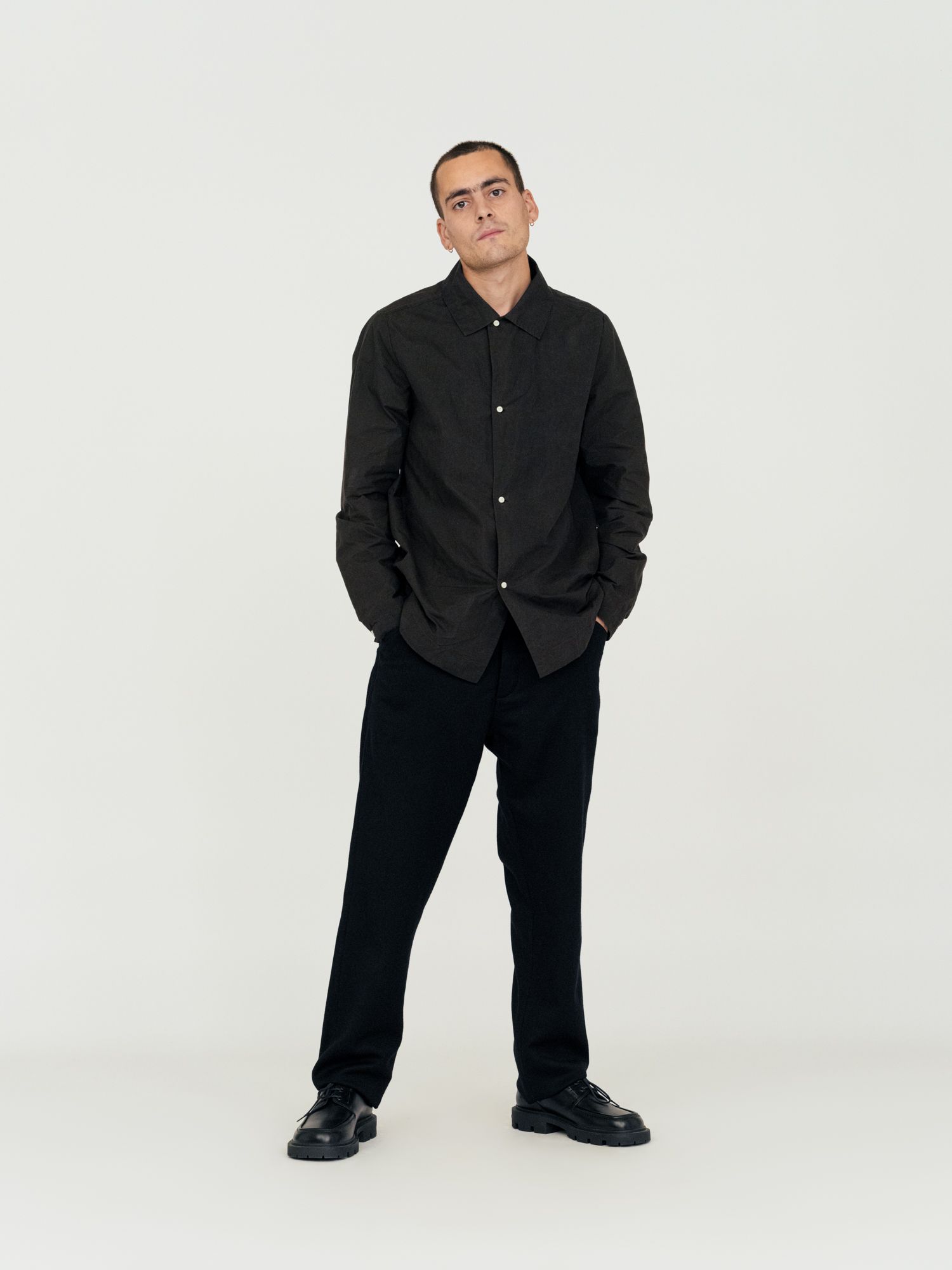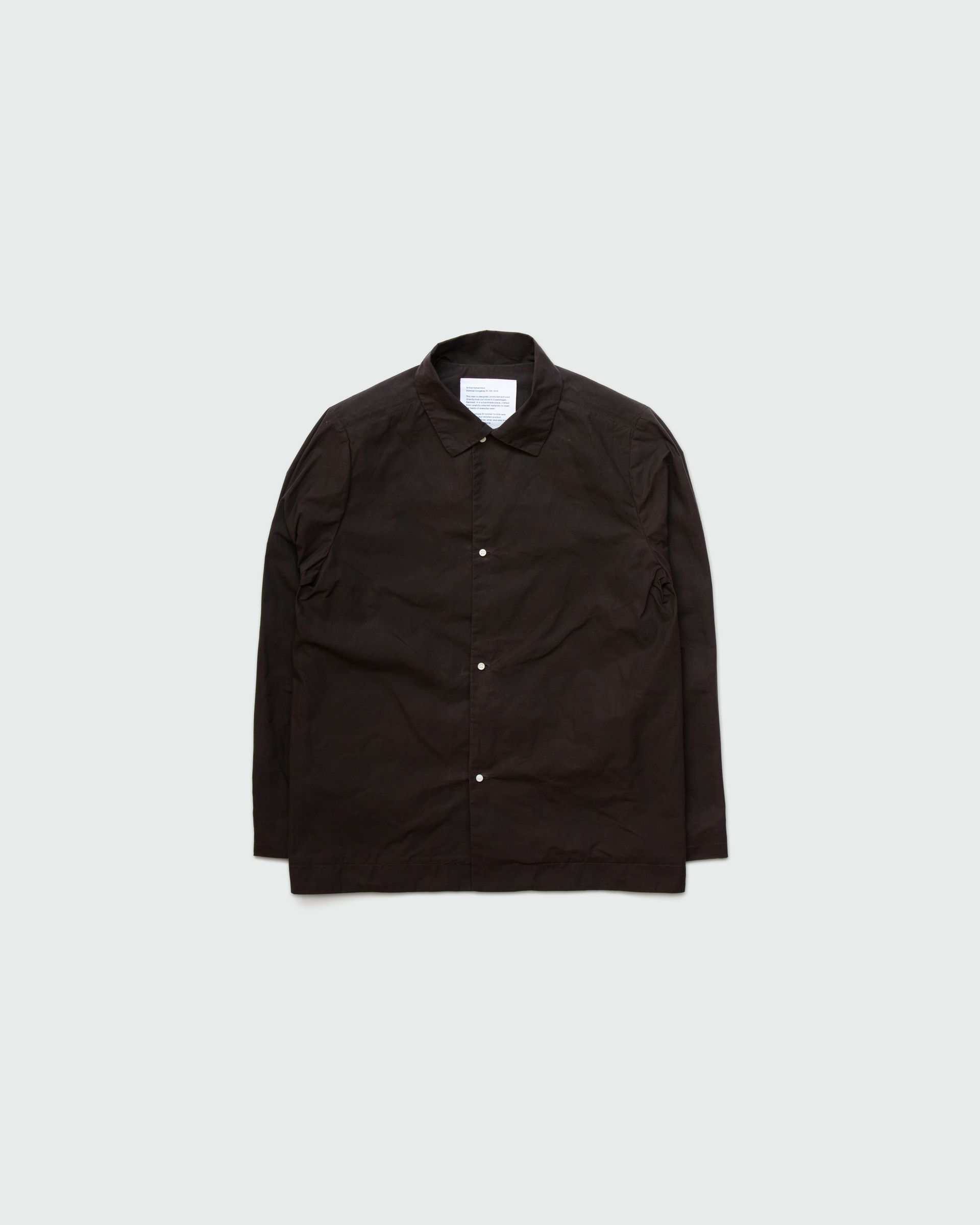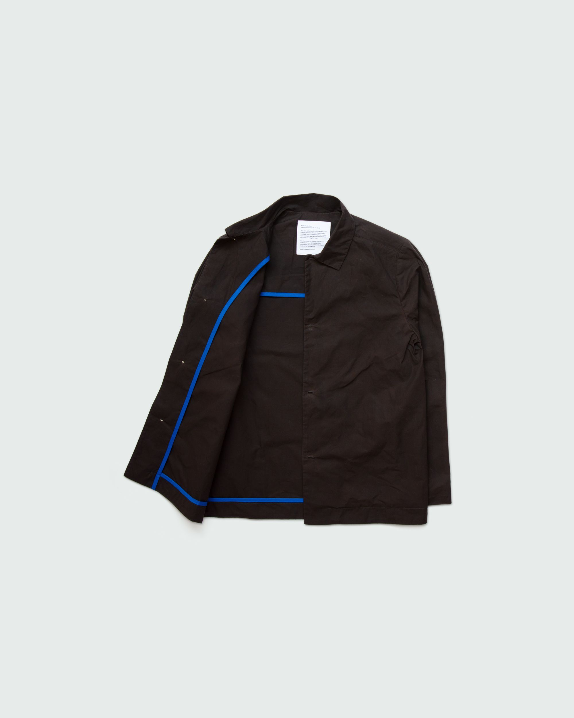 Relaxed fit shirt. Mother-of-pearl buttons on body and cuffs. Inside blue lining. Unisex..