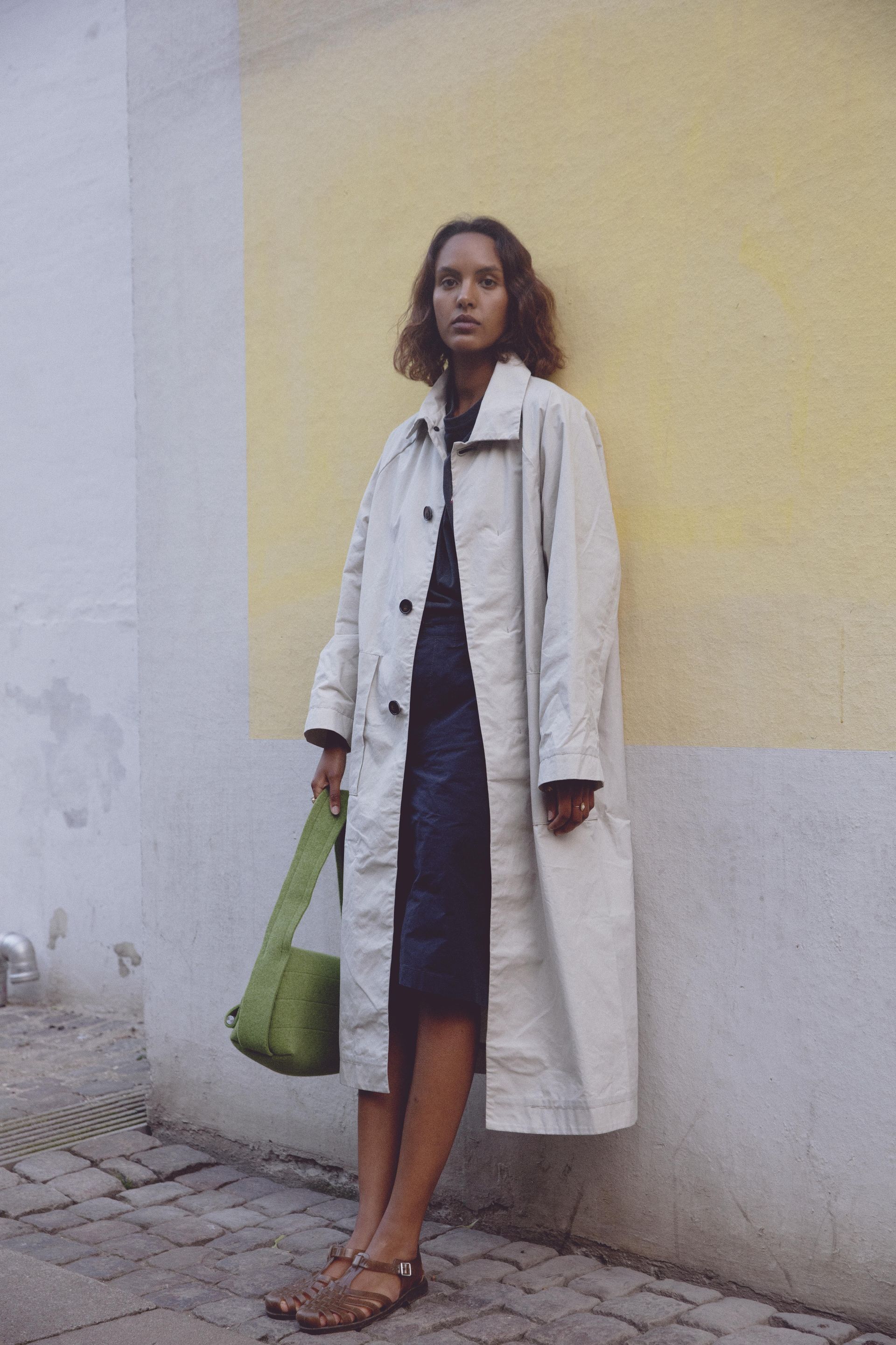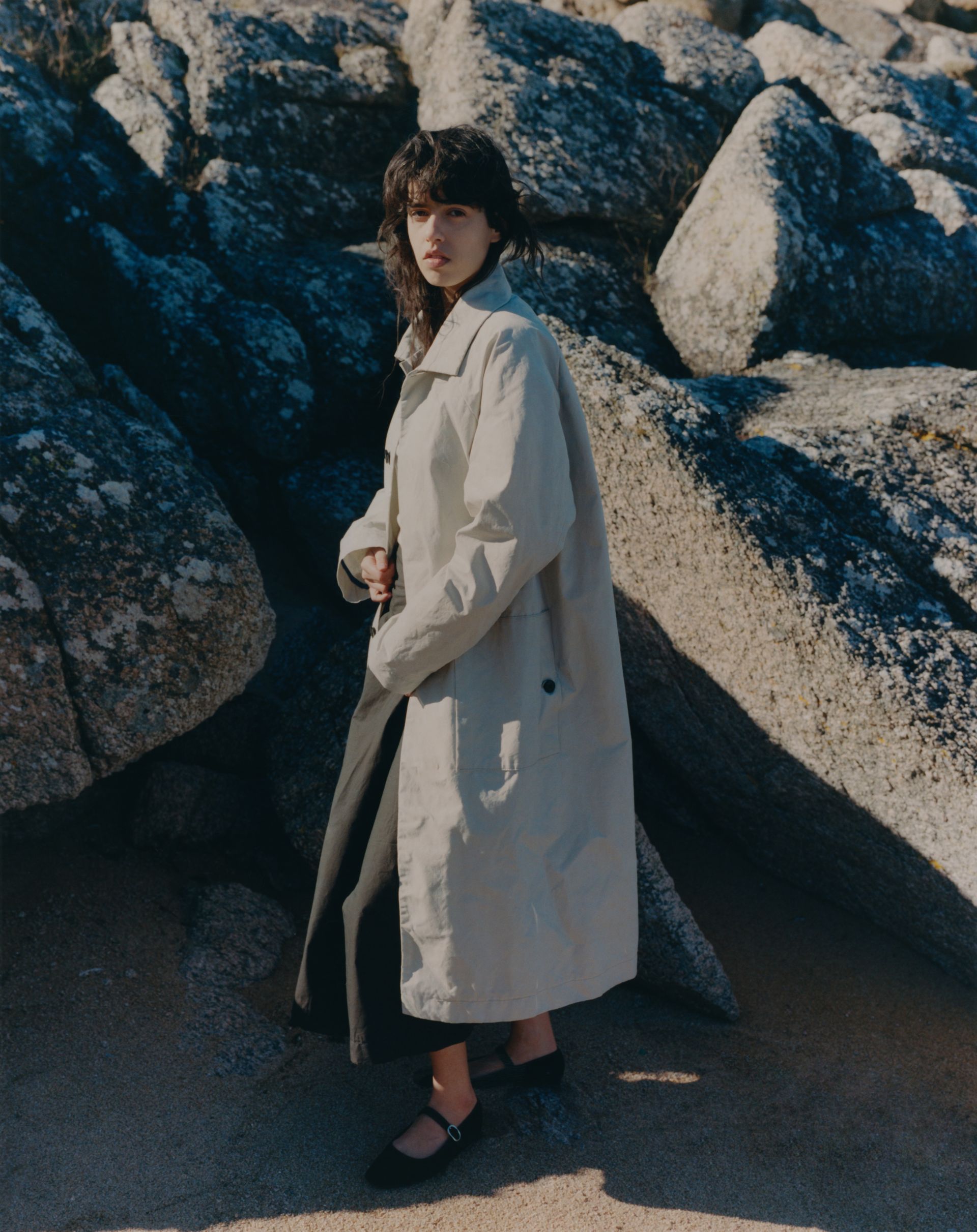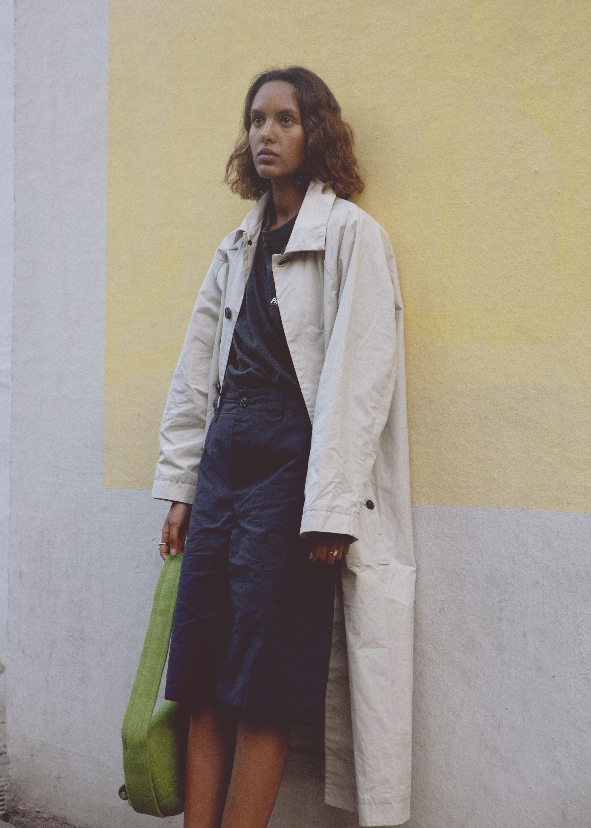 Relaxed, mid-length coat featuring raglan shoulders, two horn button side pockets and inside signature blue edging. Crafted from sturdy dry waxed treated fabric. Seals by hidden horn buttons. Unisex.