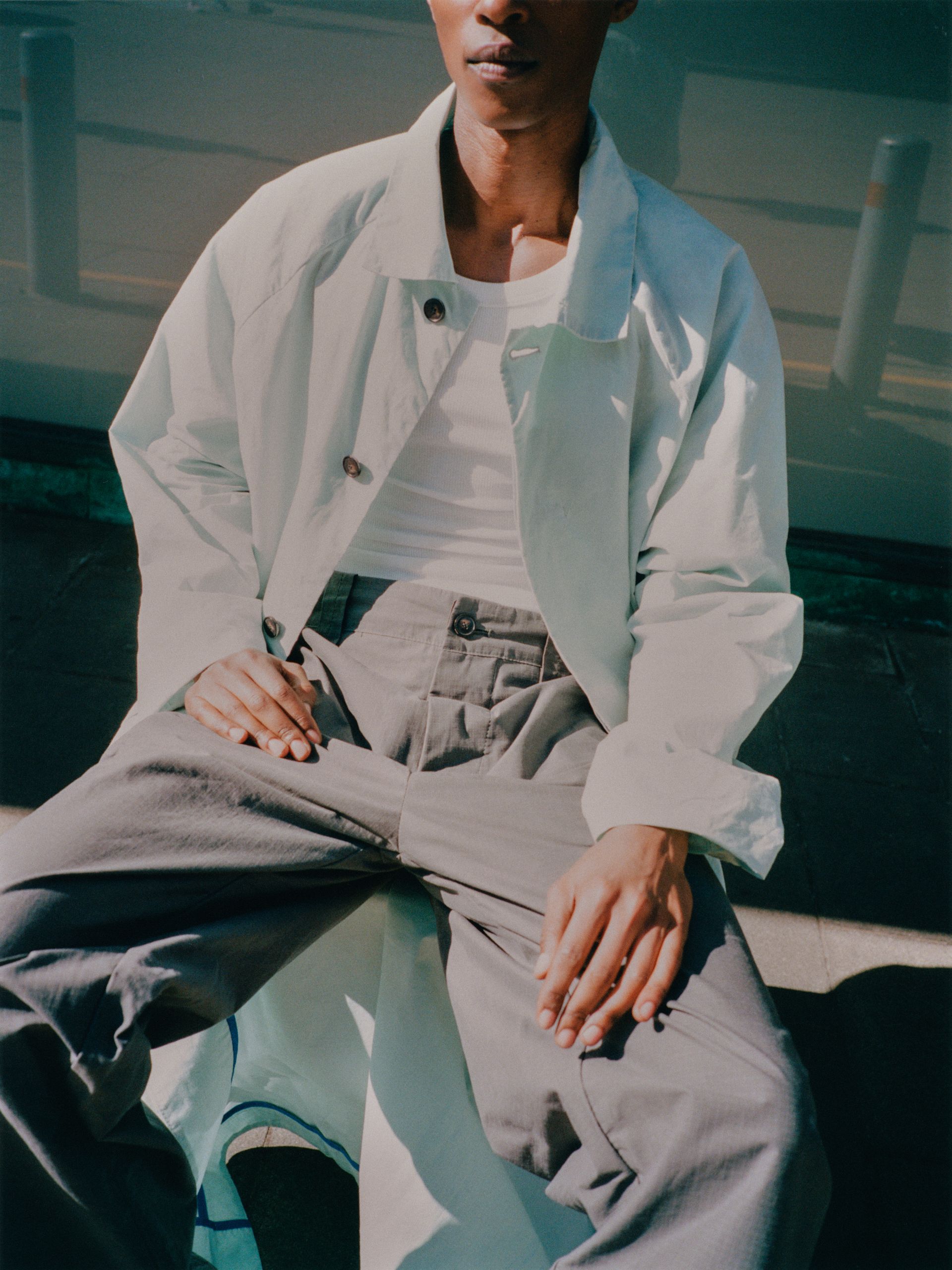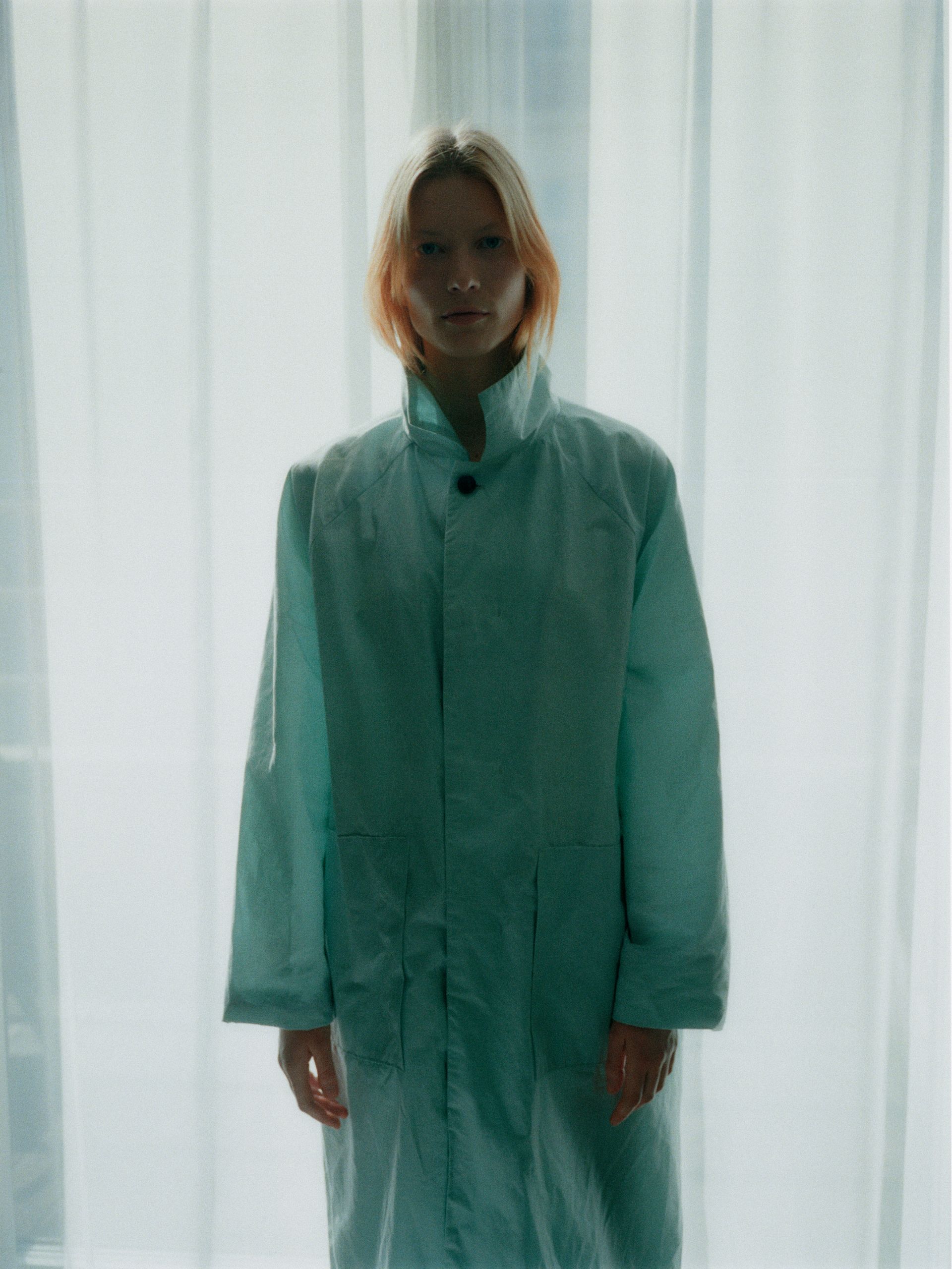 Relaxed, mid-length coat featuring raglan shoulders, two horn button side pockets and inside signature blue edging. Crafted from sturdy dry waxed treated fabric. Seals by hidden horn buttons. Unisex.