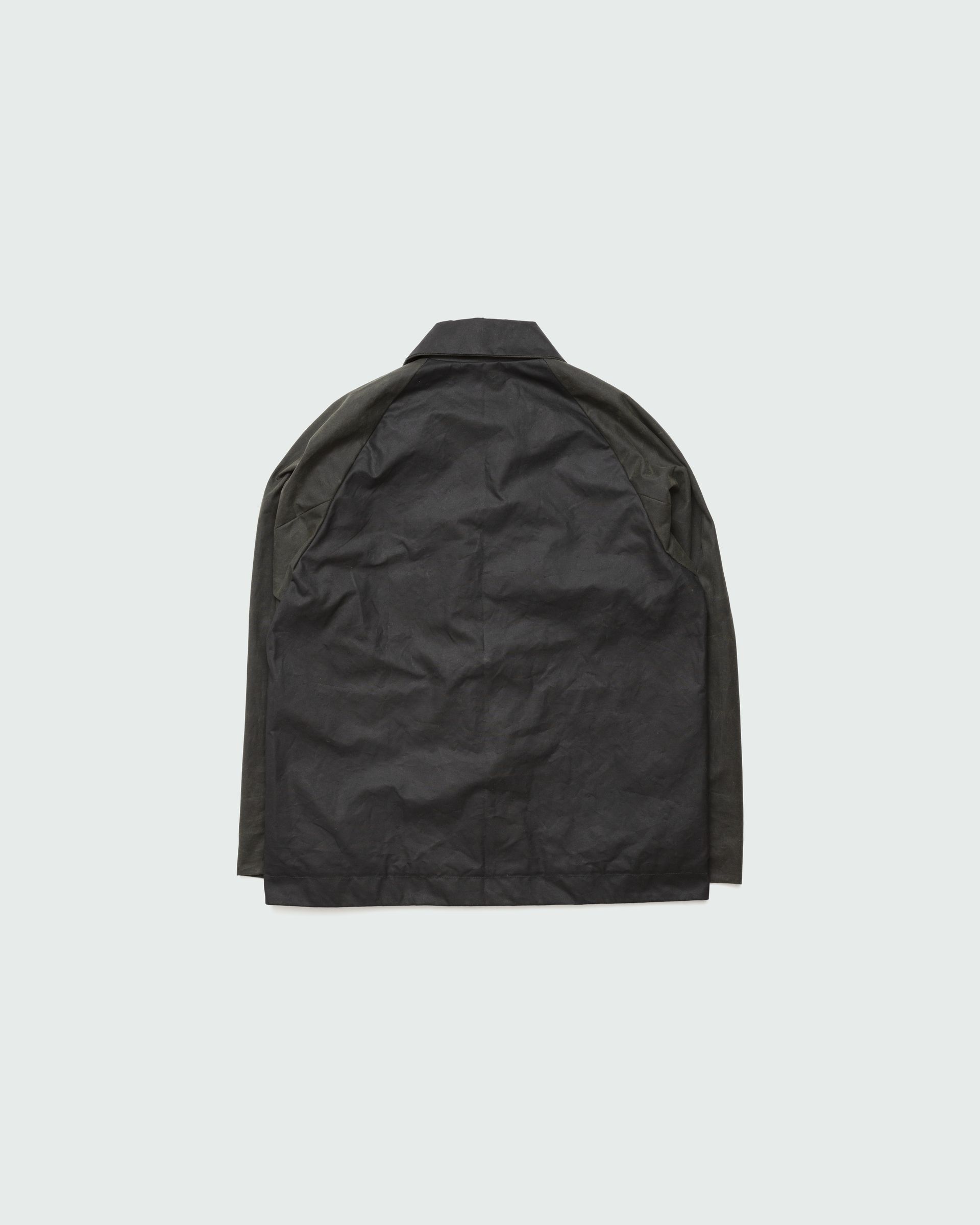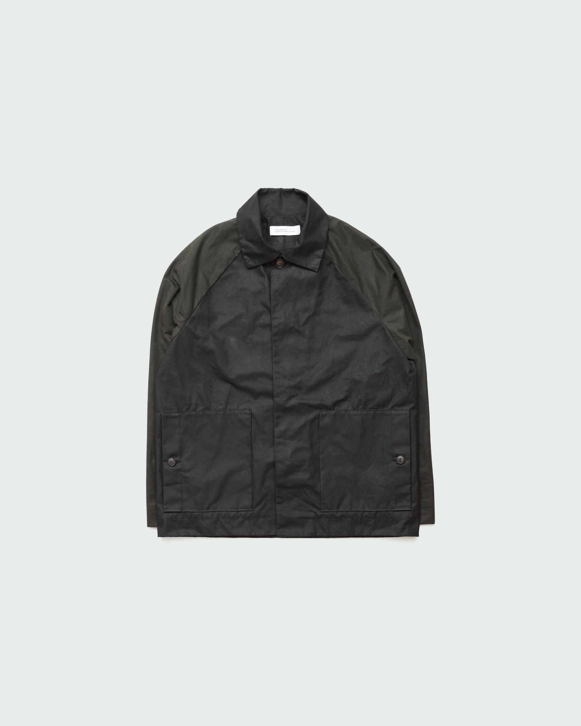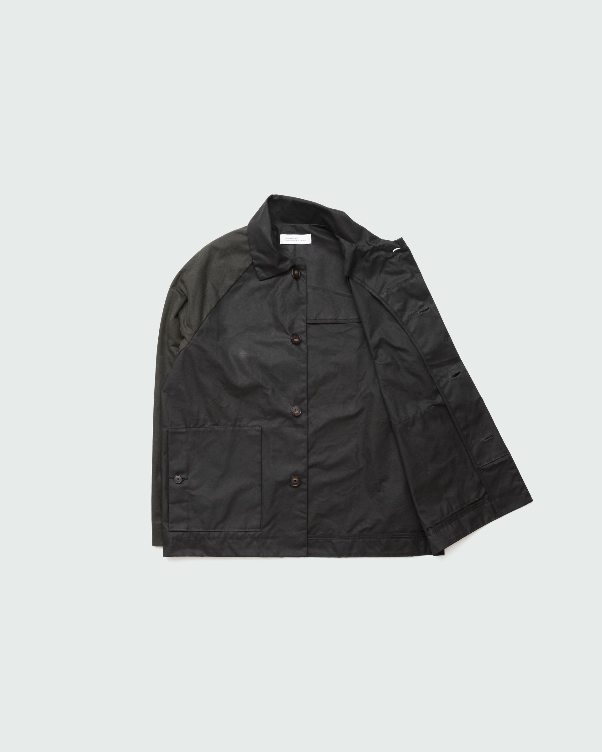 Relaxed jacket featuring raglan shoulders, two horn button side pockets and inside edging. Seals by hidden horn buttons. Unisex.
