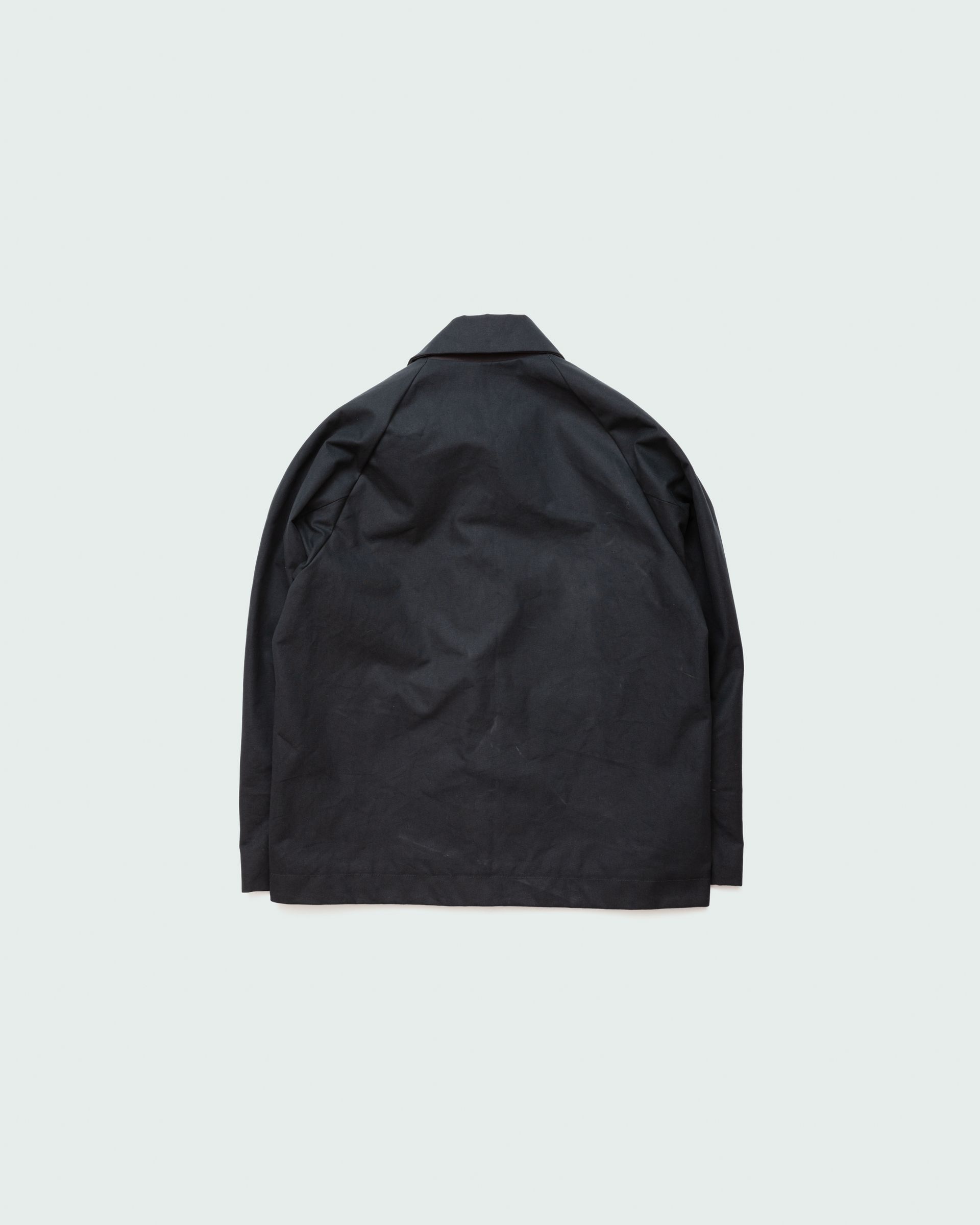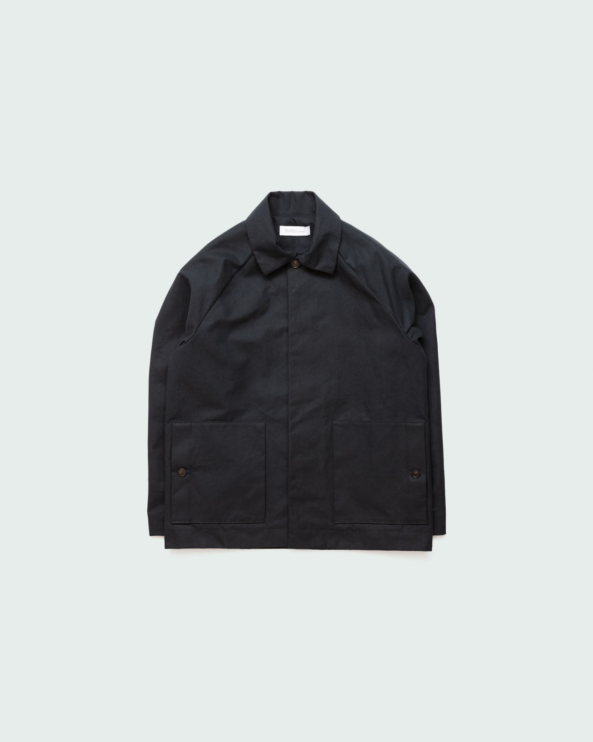 Relaxed jacket featuring raglan shoulders, two horn button side pockets and inside edging. Seals by hidden horn buttons. Unisex.