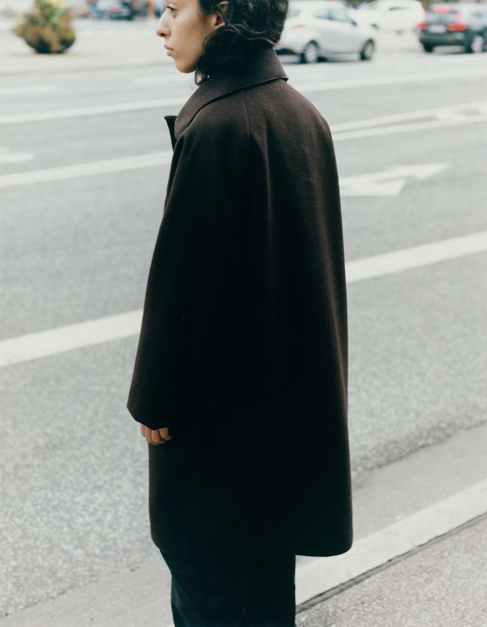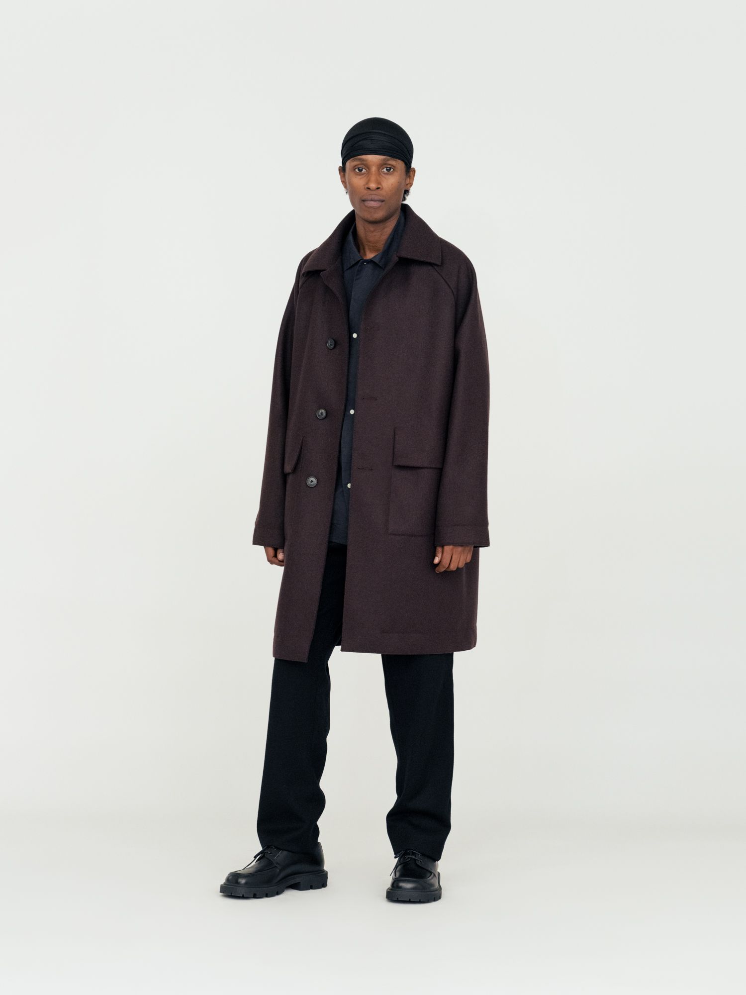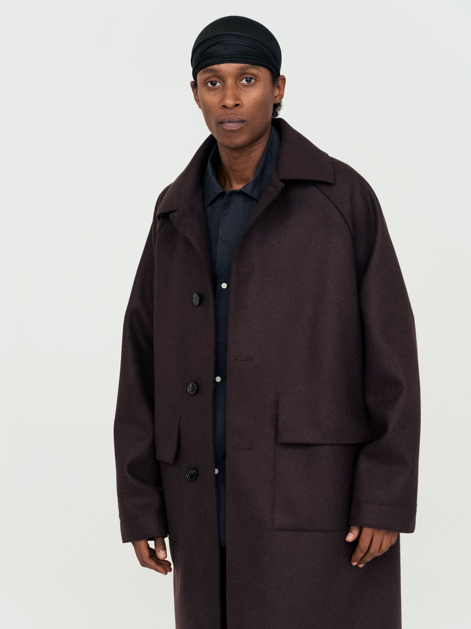 Mid-length and graphic coat made from raw edge wool. Features two large cut-out pockets, earth horn buttons and raglan shoulders. Also available as extra long, below-knee. Unisex.