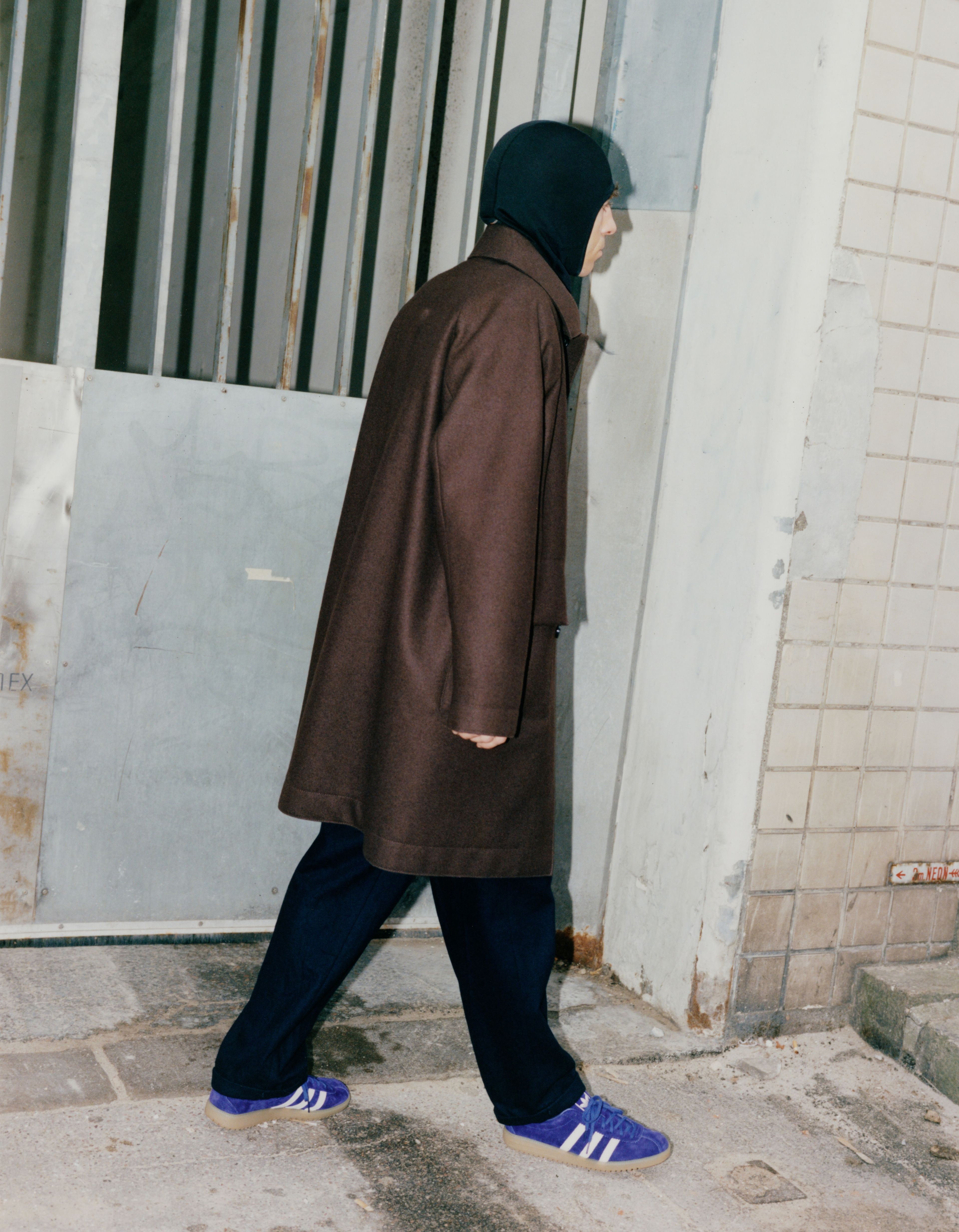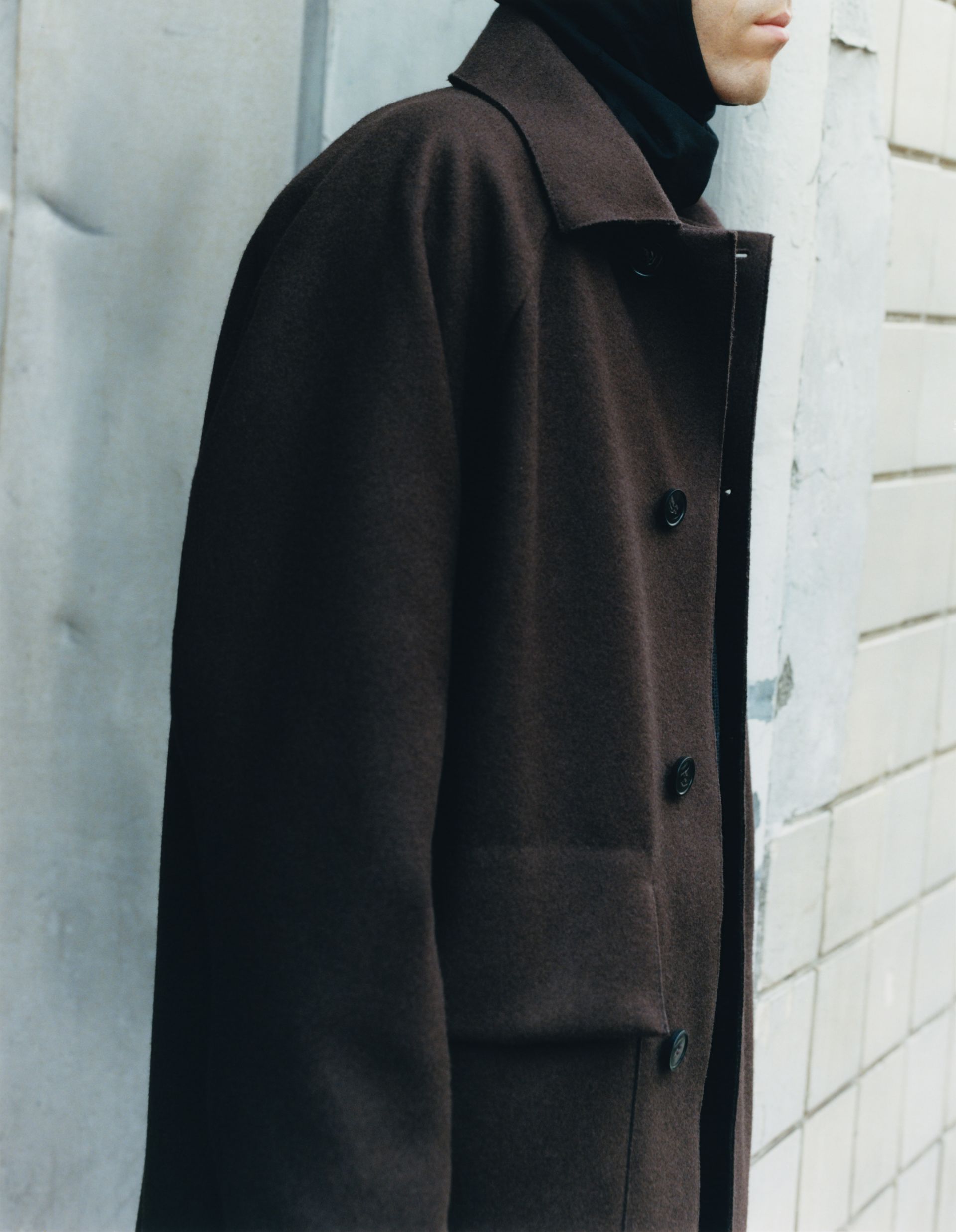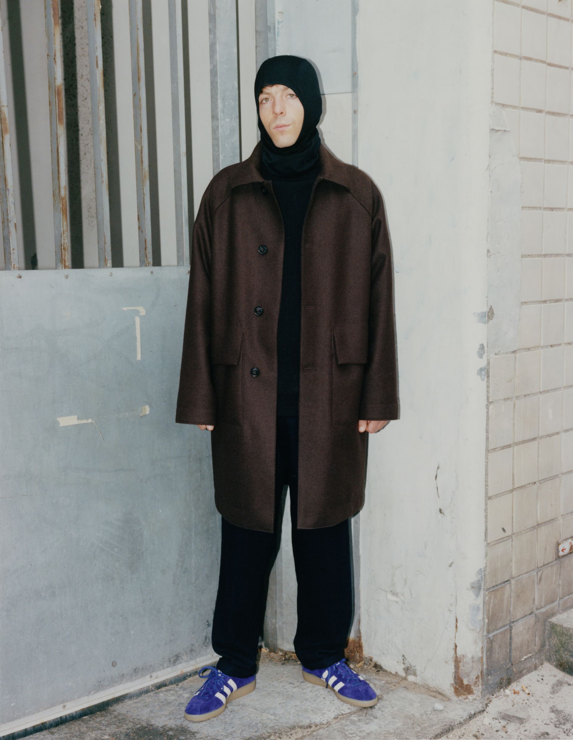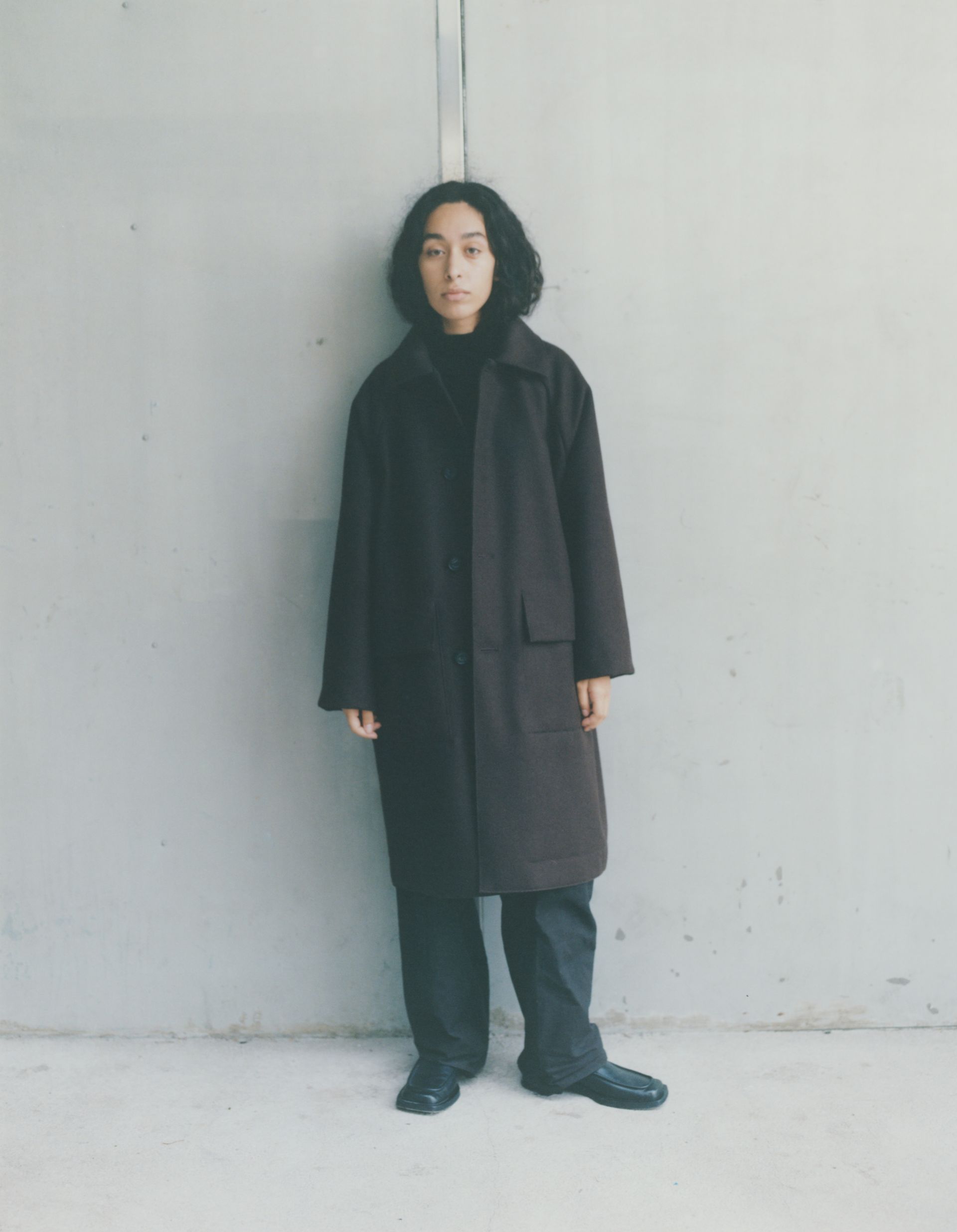 Mid-length and graphic coat made from raw edge wool. Features two large cut-out pockets, earth horn buttons and raglan shoulders. Also available as extra long, below-knee. Unisex.