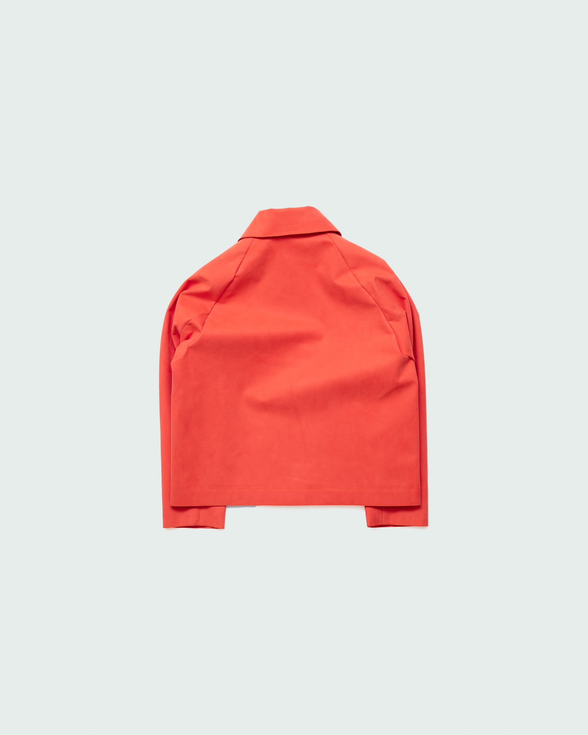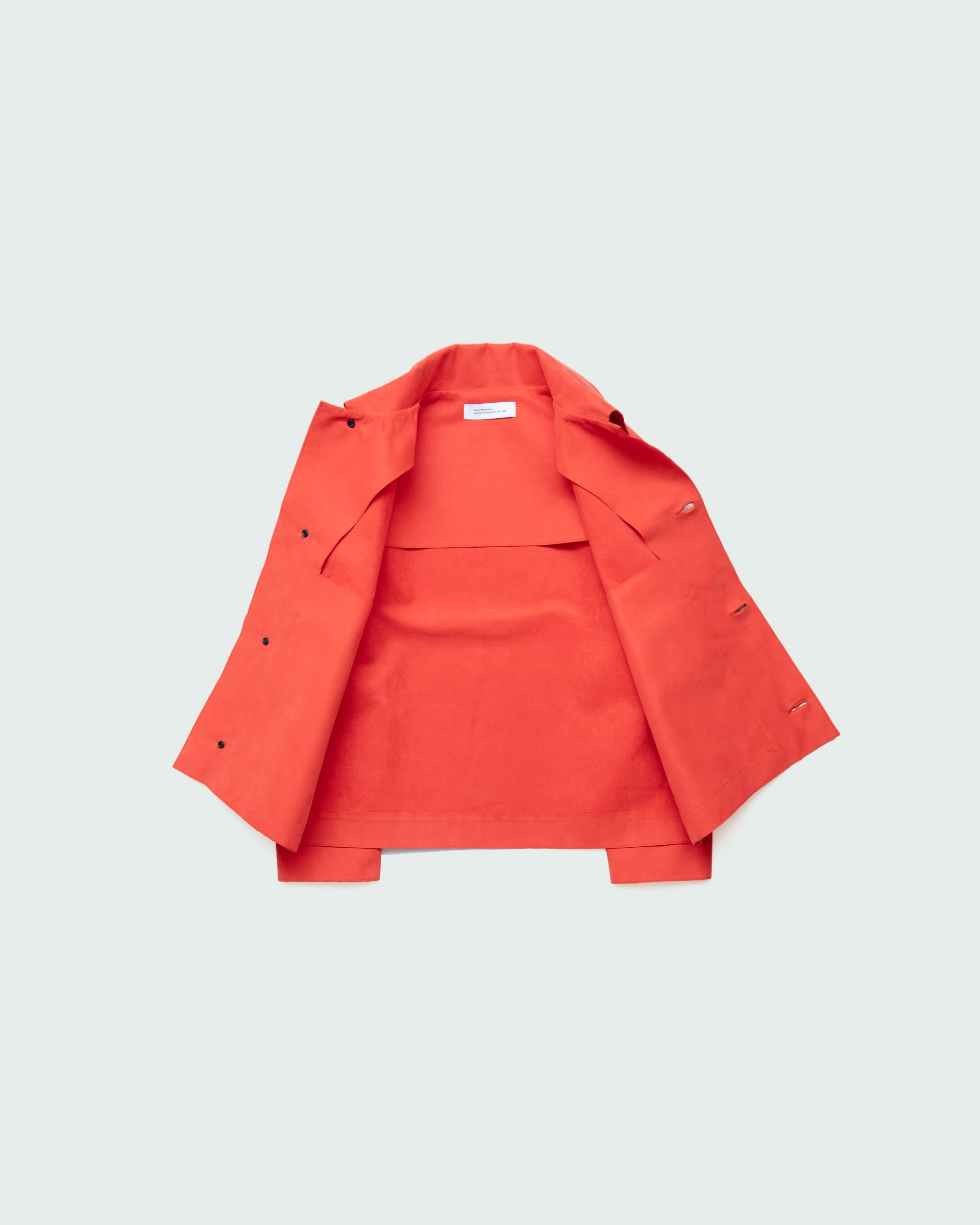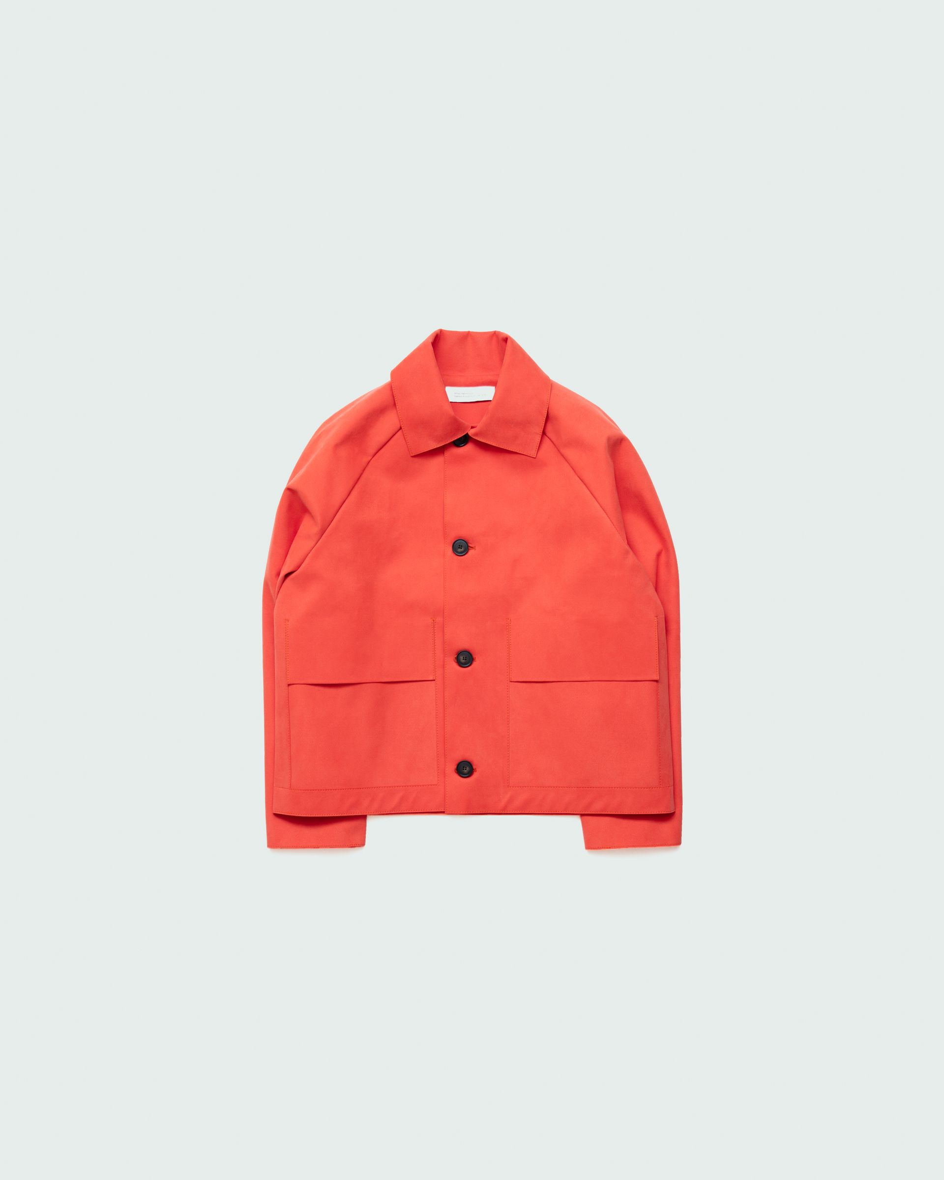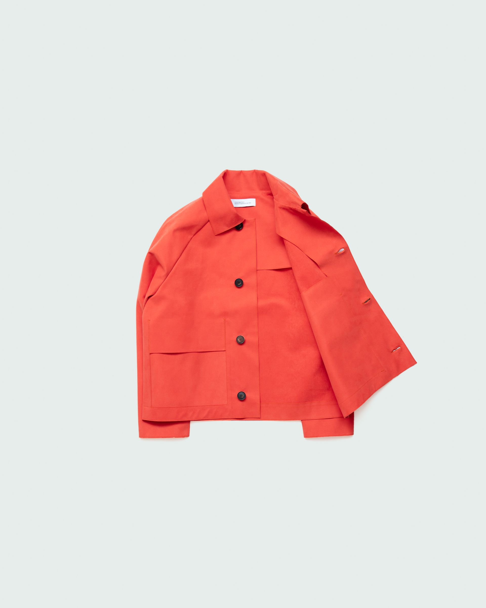 Relaxed fit jacket featuring a graphic expression with raw edges, two large cut-out pockets, earth horn buttons and raglan shoulders. Unisex.