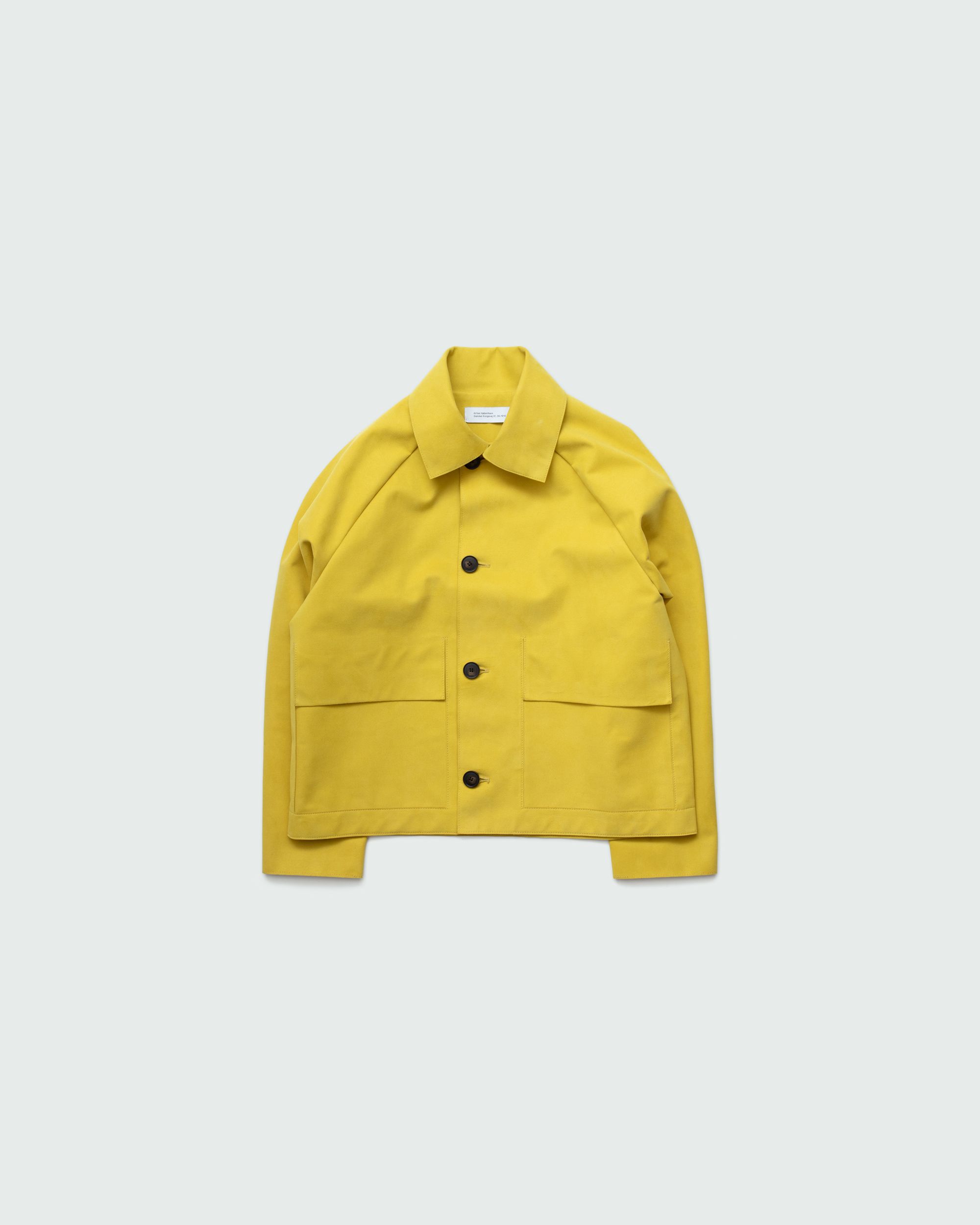 Relaxed fit jacket featuring a graphic expression with raw edges, two large cut-out pockets, earth horn buttons and raglan shoulders. Unisex.