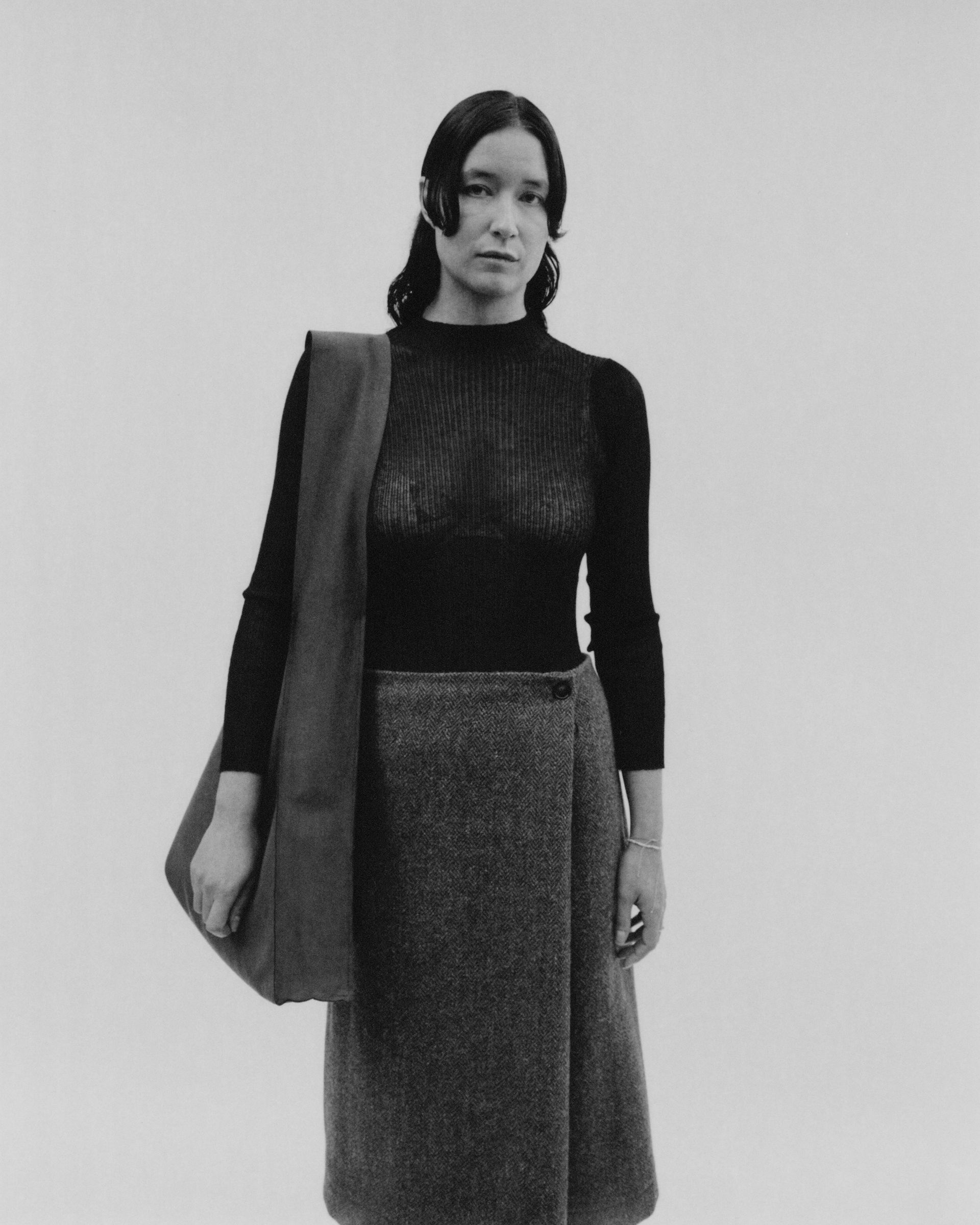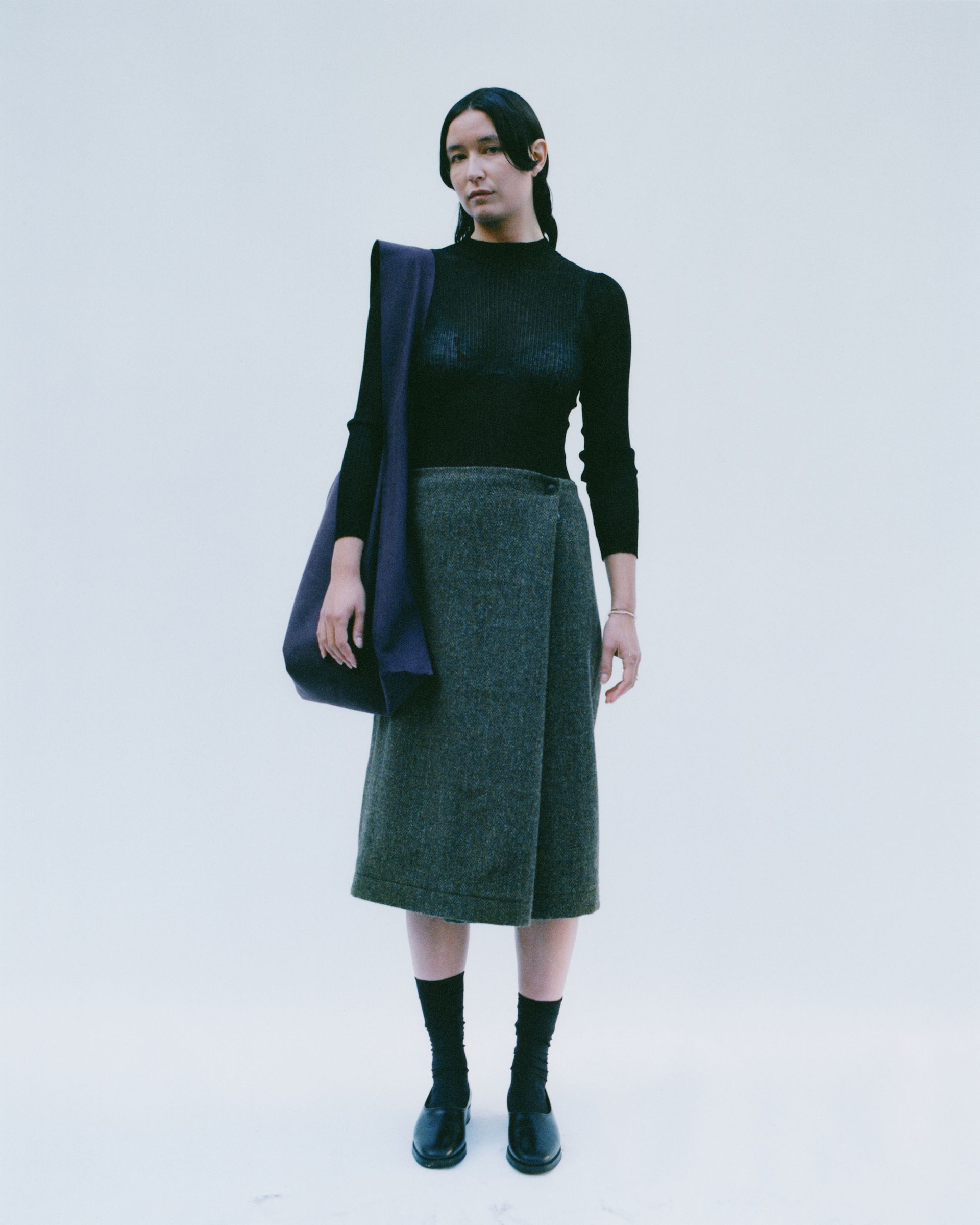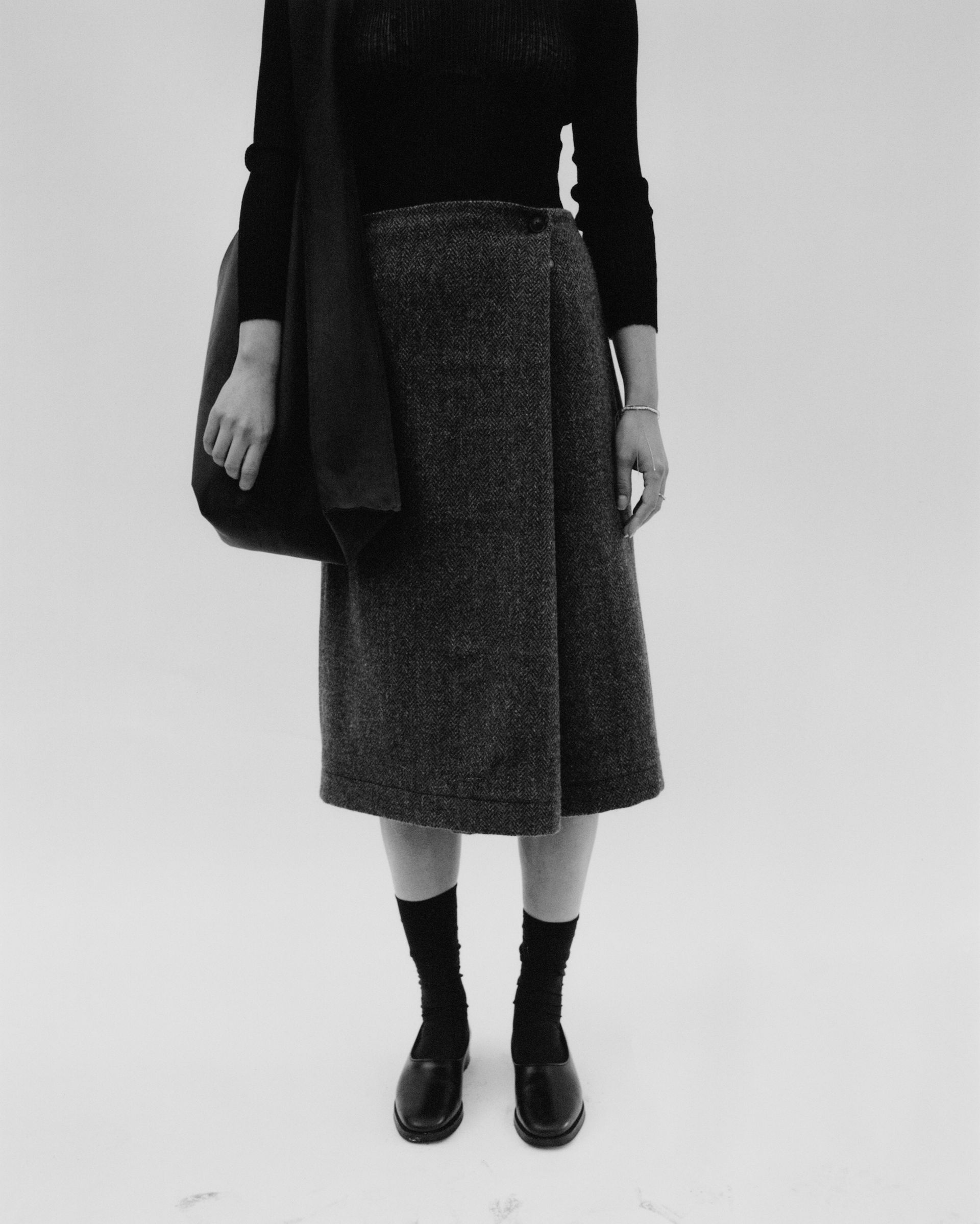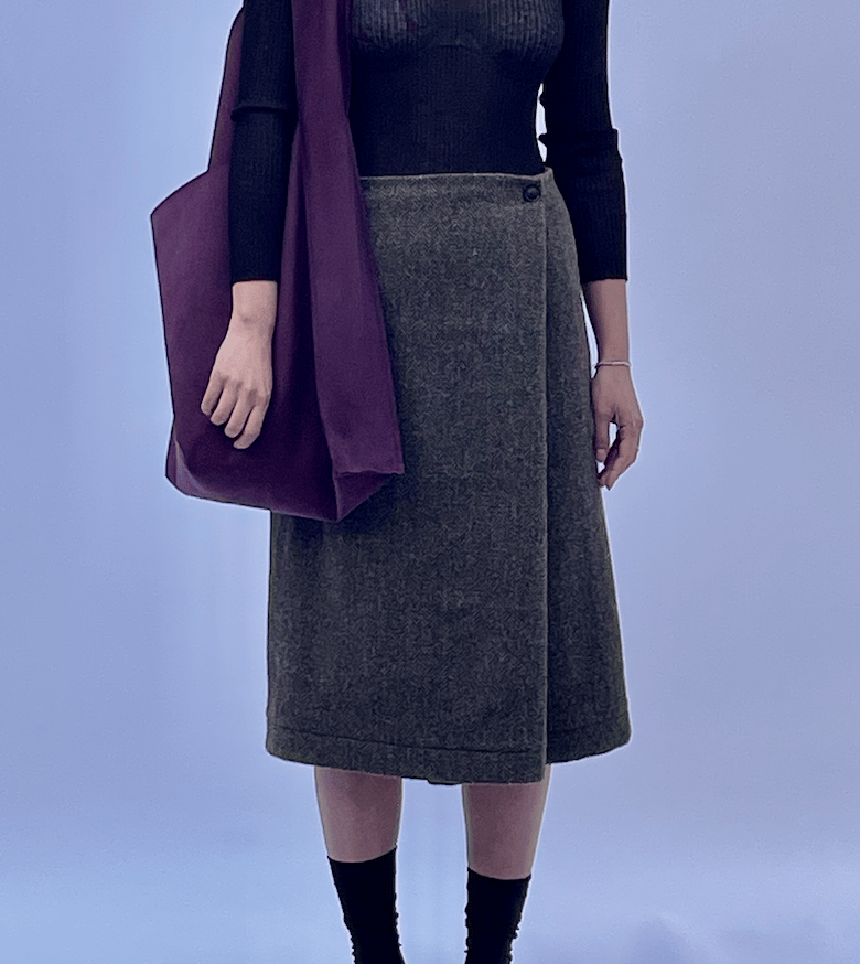 The wrap skirt follows a zero-waste design principle and features one pocket, horn buttons and a hidden push button for closure. The skirt's versatile design allows for two distinct wearing styles, one straight and the other asymmetrical, which can be achieved by adjusting the two horn buttons.