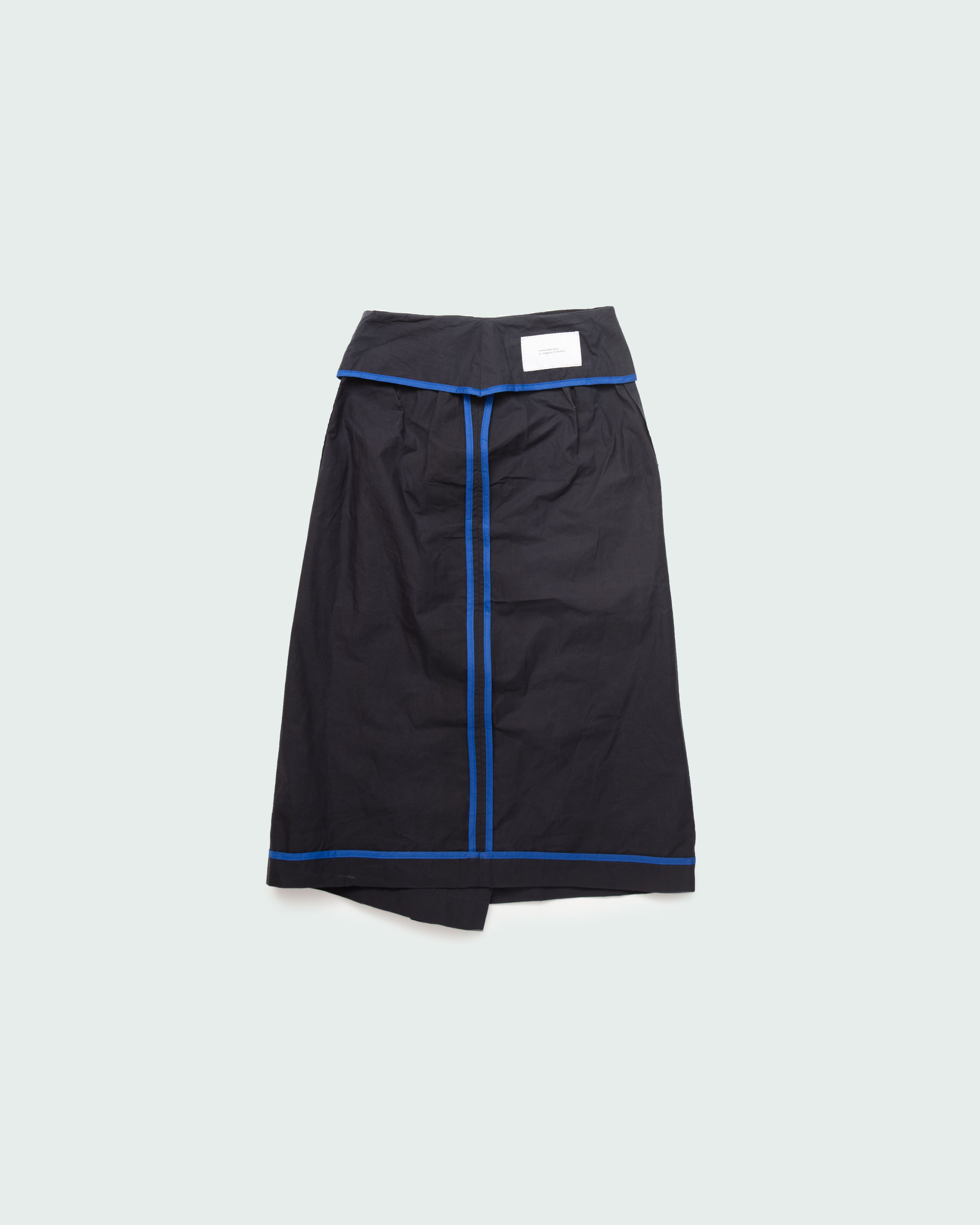 The wrap skirt follows a zero-waste design principle and features one pocket, horn buttons and a hidden push button for closure. The skirt's versatile design allows for two distinct wearing styles, one straight and the other asymmetrical, which can be achieved by adjusting the two horn buttons.