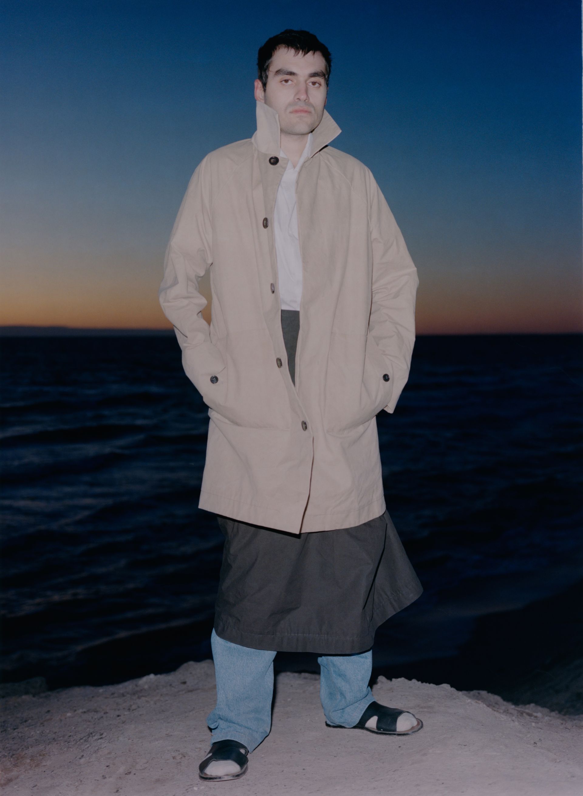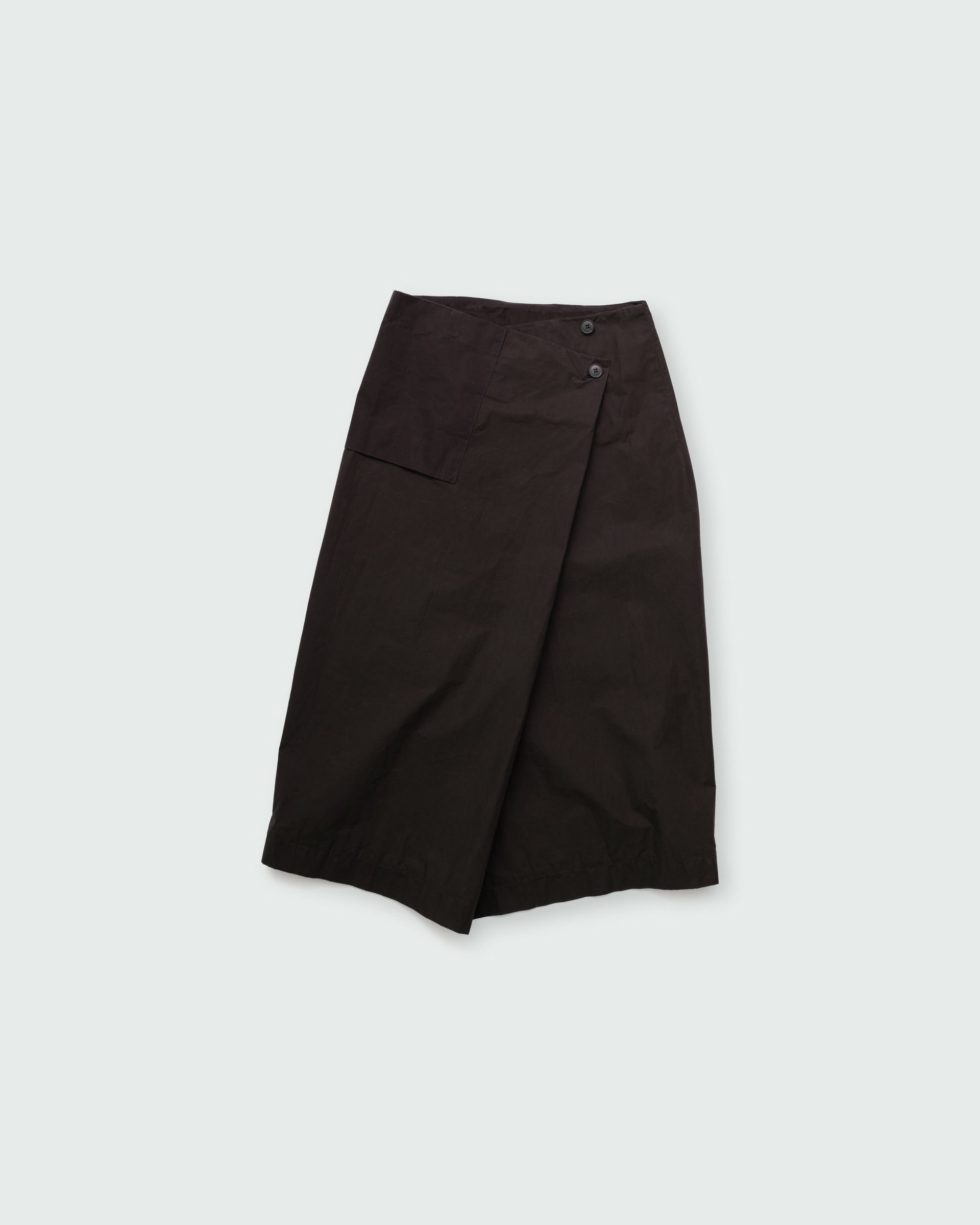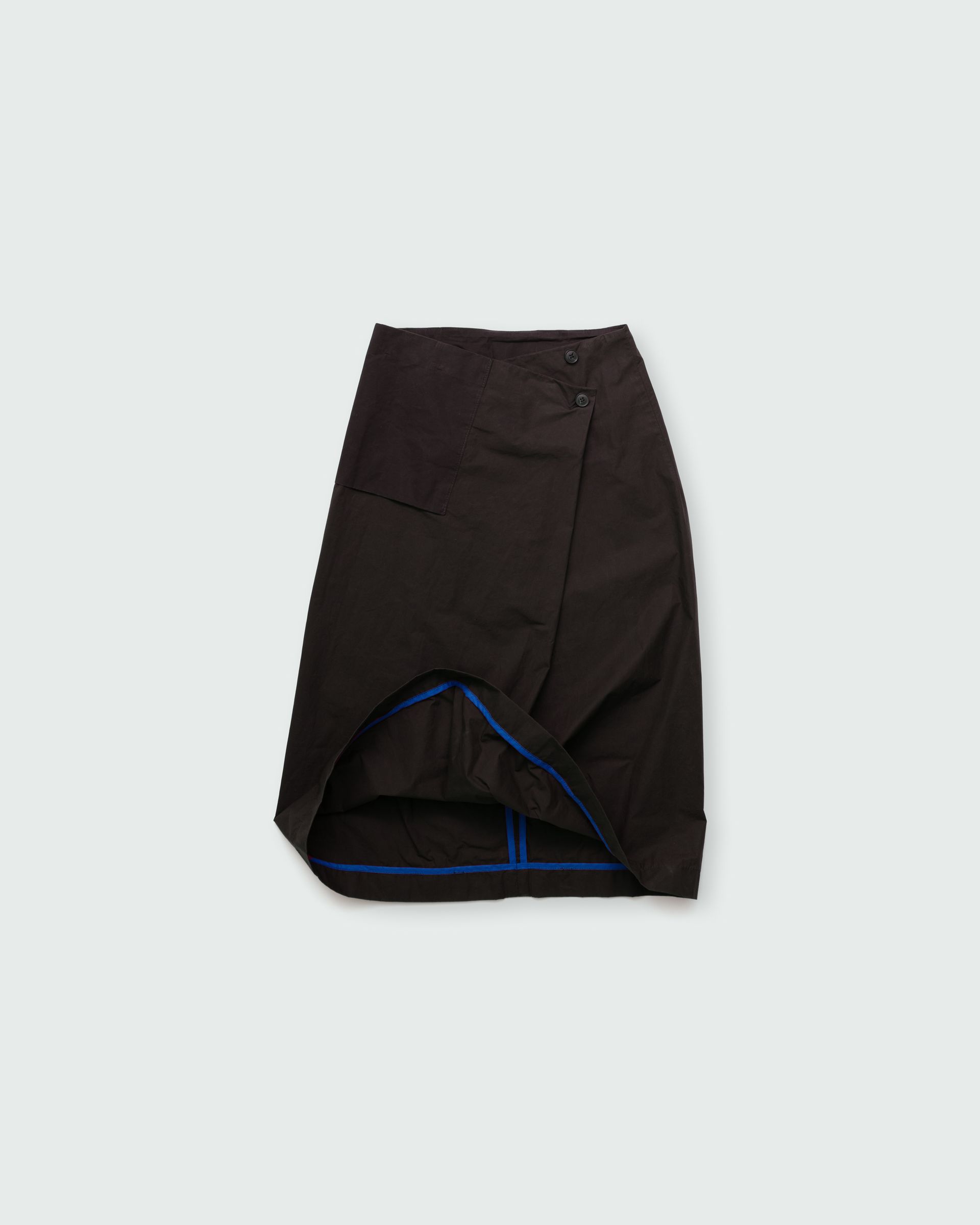 The wrap skirt follows a zero-waste design principle and features one pocket, horn buttons and a hidden push button for closure. The skirt's versatile design allows for two distinct wearing styles, one straight and the other asymmetrical, which can be achieved by adjusting the two horn buttons.
