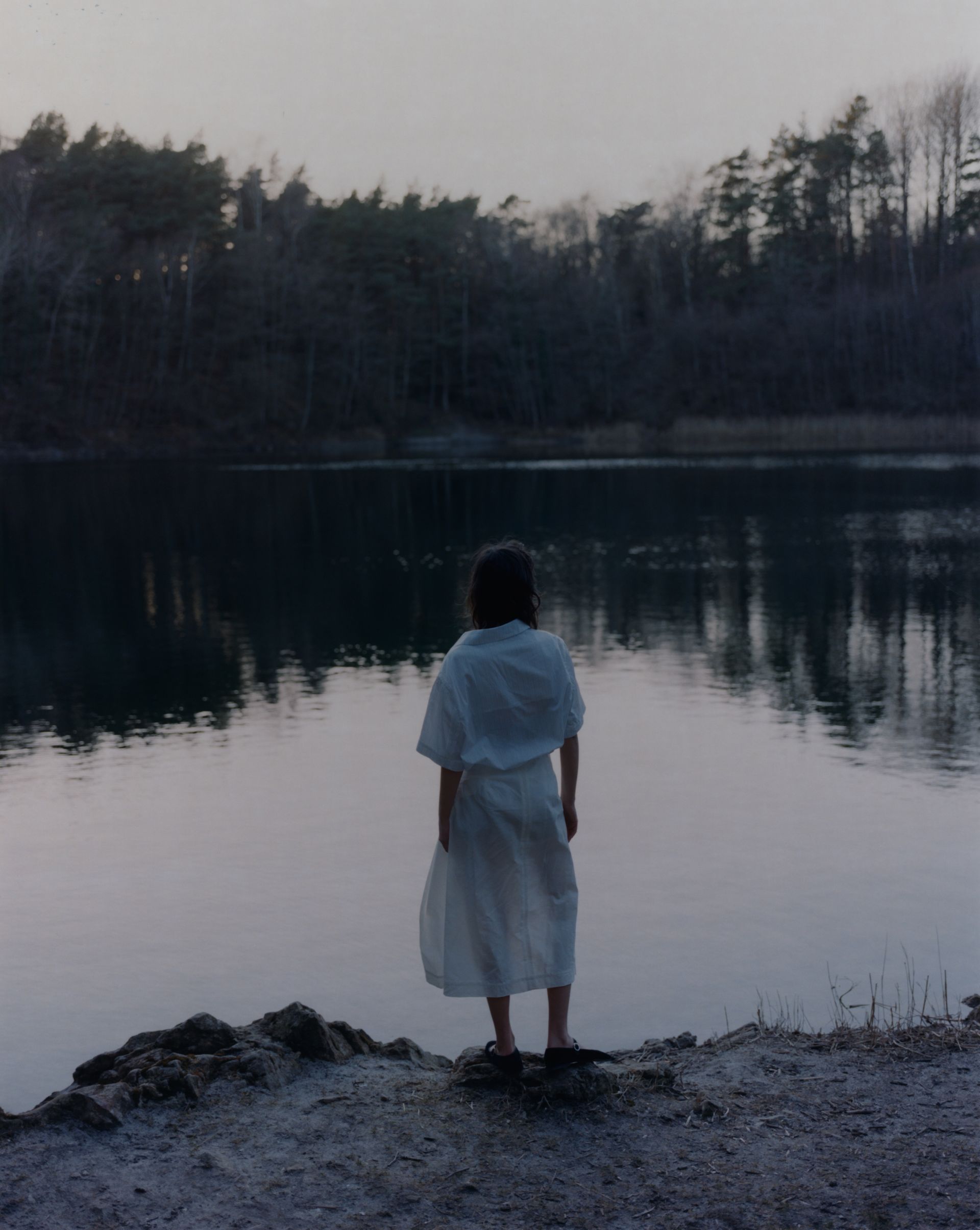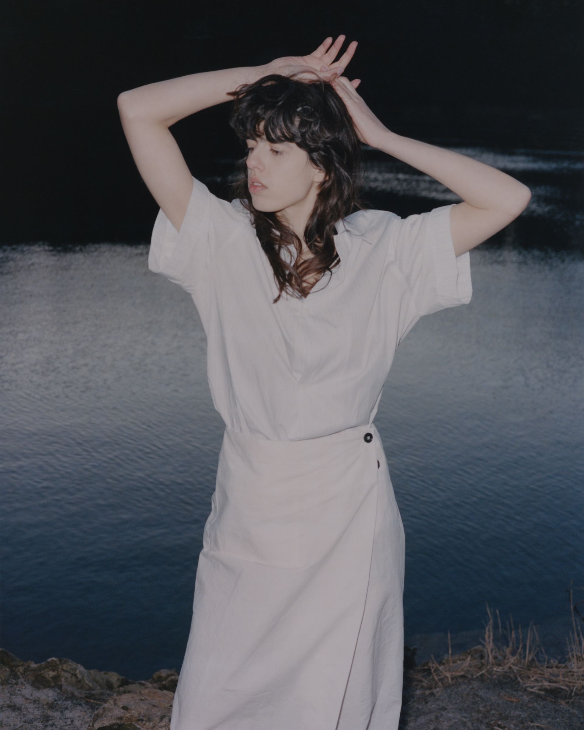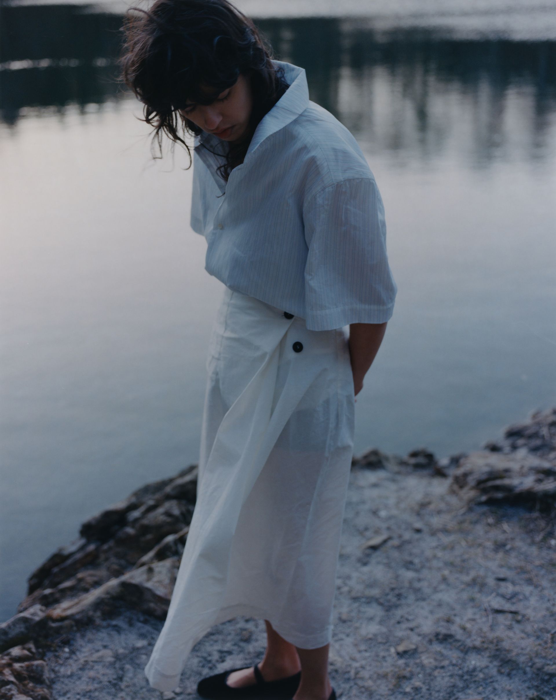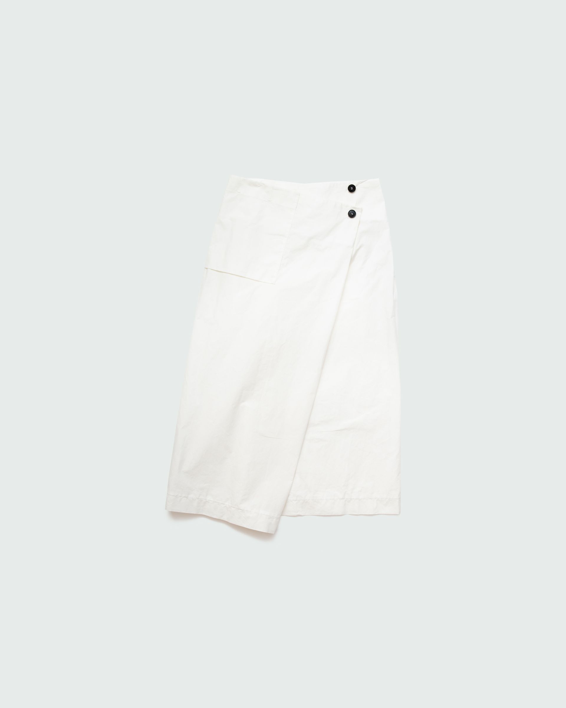The wrap skirt follows a zero-waste design principle and features one pocket, horn buttons and a hidden push button for closure. The skirt's versatile design allows for two distinct wearing styles, one straight and the other asymmetrical, which can be achieved by adjusting the two horn buttons.